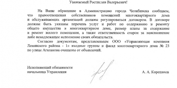 Номер жалобы:28628 Тип жалобы:Иные проблемы ЖКХ Название объекта:Управляющая компания Ленинского района - 1 Регион:Челябинская область Город:Челябинск Адрес:ул. Агалакова, 23 Описание жалобы:Уважаемая УКЛР-1 вынужден отправить жалобу в Ваш адрес. Живу в доме по ул. Агалакова 23 на протяжении уже 7 лет. В течении этого времени фасад дома и входные группы подъездов находятся в ужасающем состоянии. Убедительная просьба выполнить следующее:
