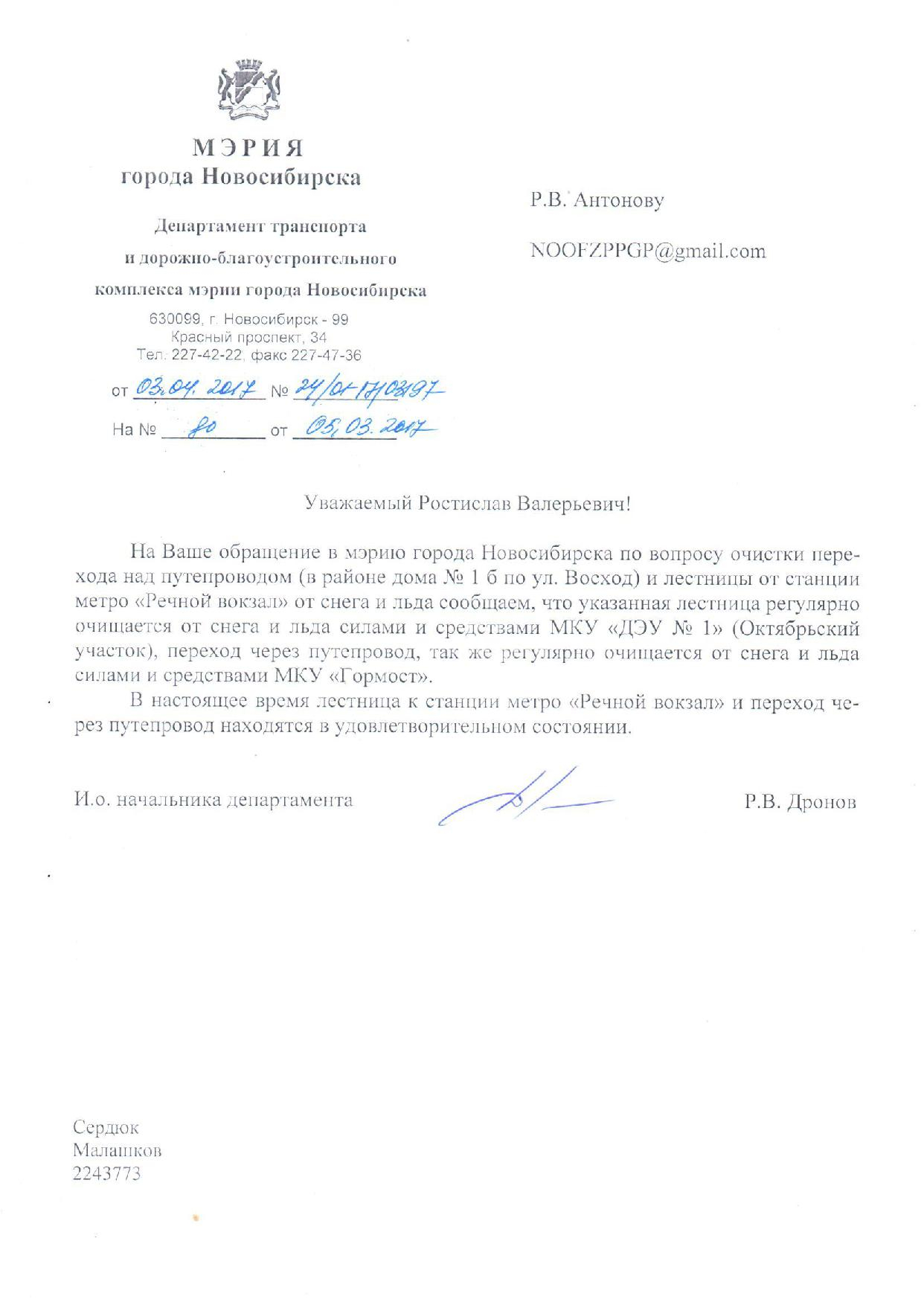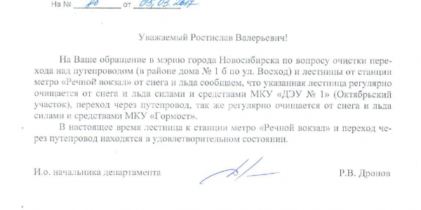 Номер жалобы:15044 Тип жалобы:Прочее Название объекта:Муниципалитет Регион:Новосибирская область Город:Новосибирск Адрес:ул. Восход, 1Б Описание жалобы:Ответ на обращение 10013 не по существу. По состоянию на 03.03.17:
