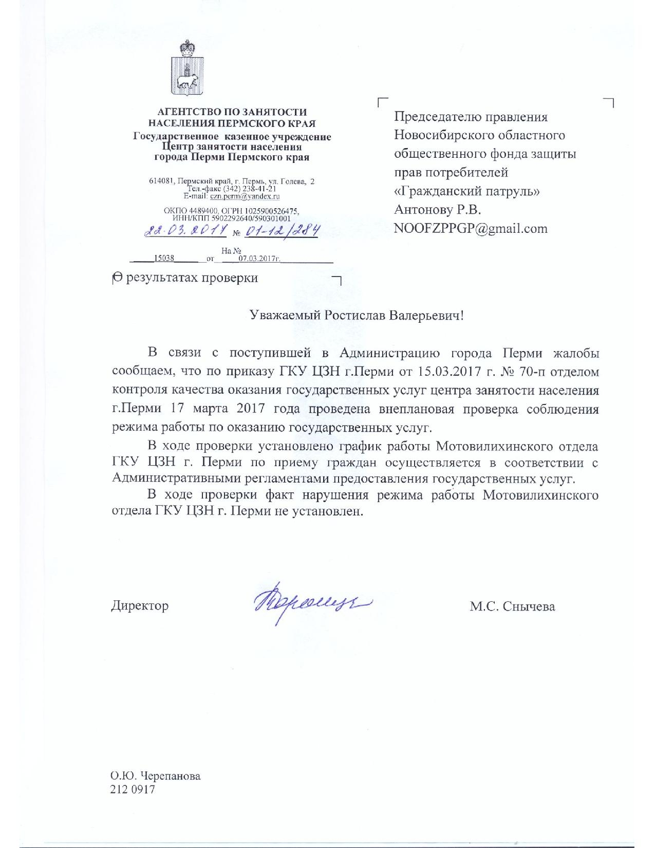 Номер жалобы:15038 Тип жалобы:Прочее Название объекта:Цнз Мотовилихинского Района Г.Перми Регион:Пермский край Город:Пермь Адрес:улица 1905 года, 1 Описание жалобы:Работает организация до 17-00;я была рядом в 16-00 и решила зайти,чтобы встать на учет платный. На руках были все необходимые документы. До 16-15я оформила все справки(сказали сдать всего лишь паспорт и трудовую,о дипломе и справки о ср.зар.плате сначало умолчали.Т.к.я знала о сдаче этих документов предложила их регистратору сама) и пошла к кабинету #3. Передо мною было еще 2человека которые хотели встать на учет. Вышла женщина-инспектор и сказала мне чтобы я шла домой,т.к.была последняя я,и меня не примет никто,т.к.времени было уже много.(регистратор по тел.вообще сказала,что они до 18-00работают). Я сказала,что хочу подождать до конца,но женщина мне ответила"если вас не примут-мы не виноваты,я предупредила". Ужасное отношение работников к людям. Статус: