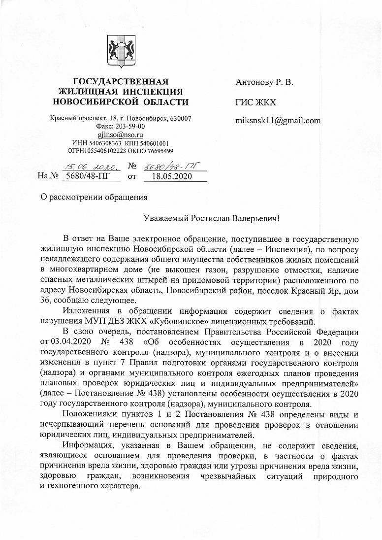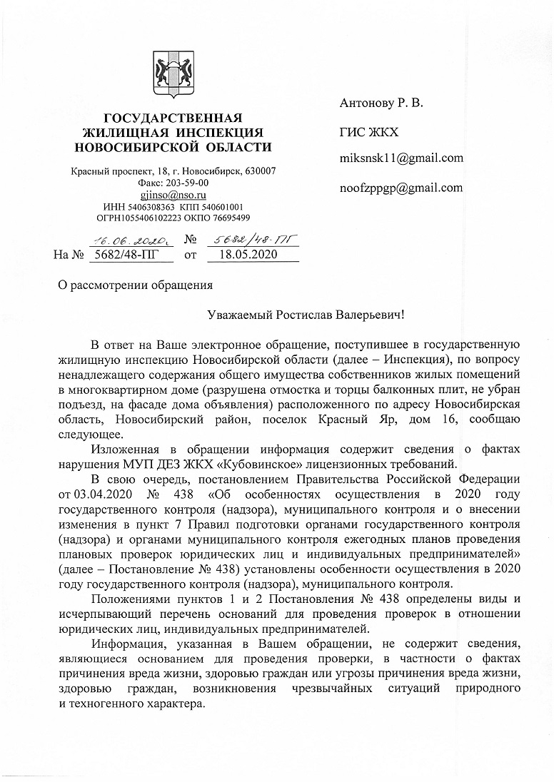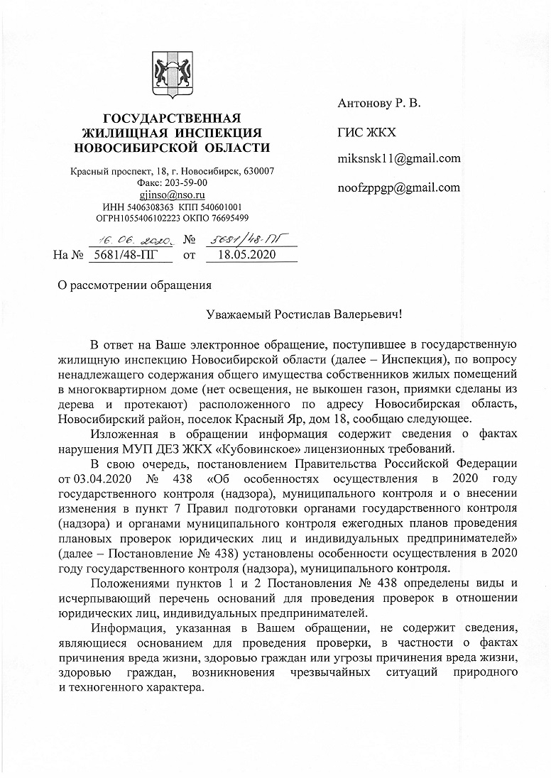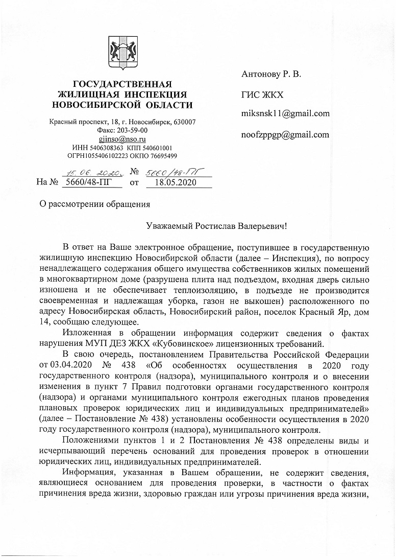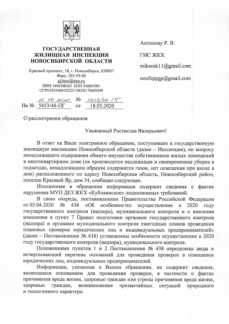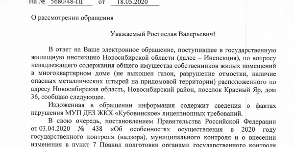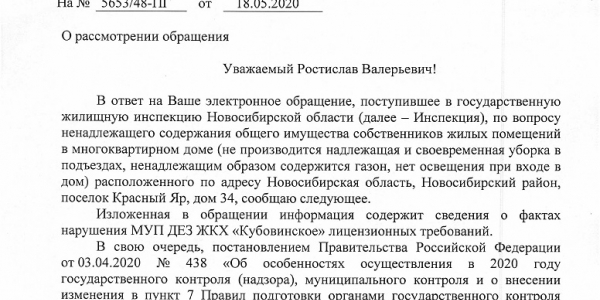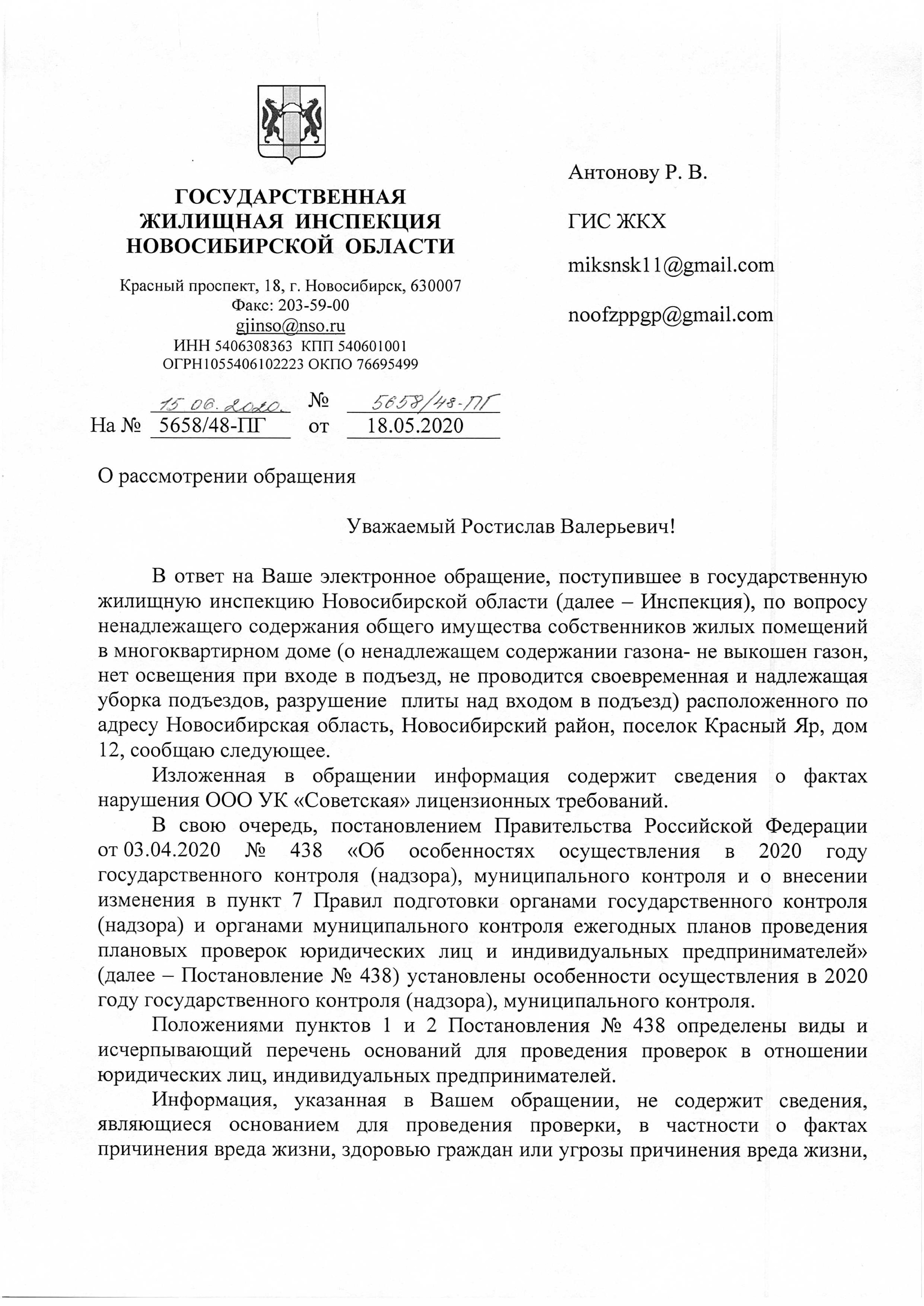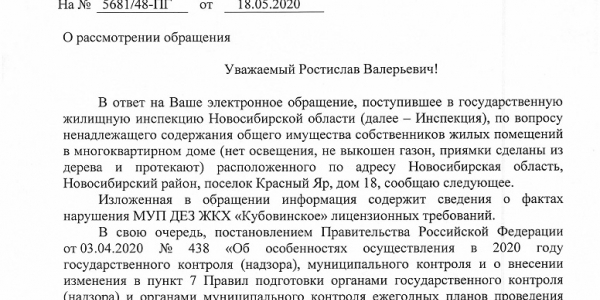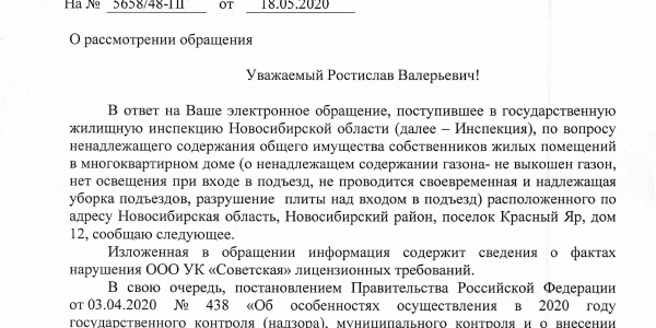 Номер жалобы:66038 Тип жалобы:Иные проблемы ЖКХ Название объекта: Регион:Новосибирская область Город:посёлок Красный Яр Адрес:посёлок Красный Яр, 34 Описание жалобы:не выкошен газон, не убирается подъезд, нет освещения Статус: