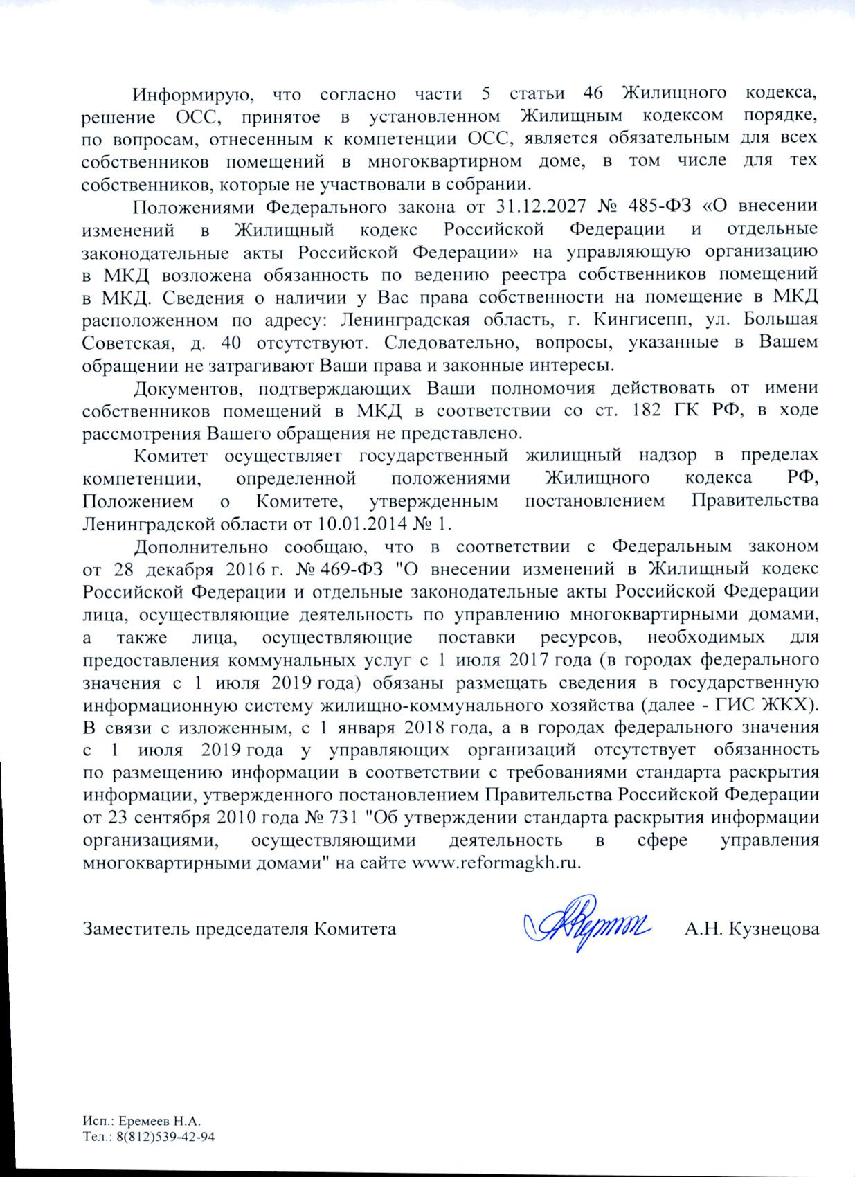 Номер жалобы:65450 Тип жалобы:Иные проблемы ЖКХ Название объекта: Регион:Ленинградская область Город:Кингисепп Адрес:Большая Советская улица, 40 Описание жалобы:Купила такое жилье. Обращалась ук. Акты не дали. На руки. Только фото сделали. И на этом все. Подъезд 3 кв 43.89643997779 Протосеня Оксана Владимировна Статус: