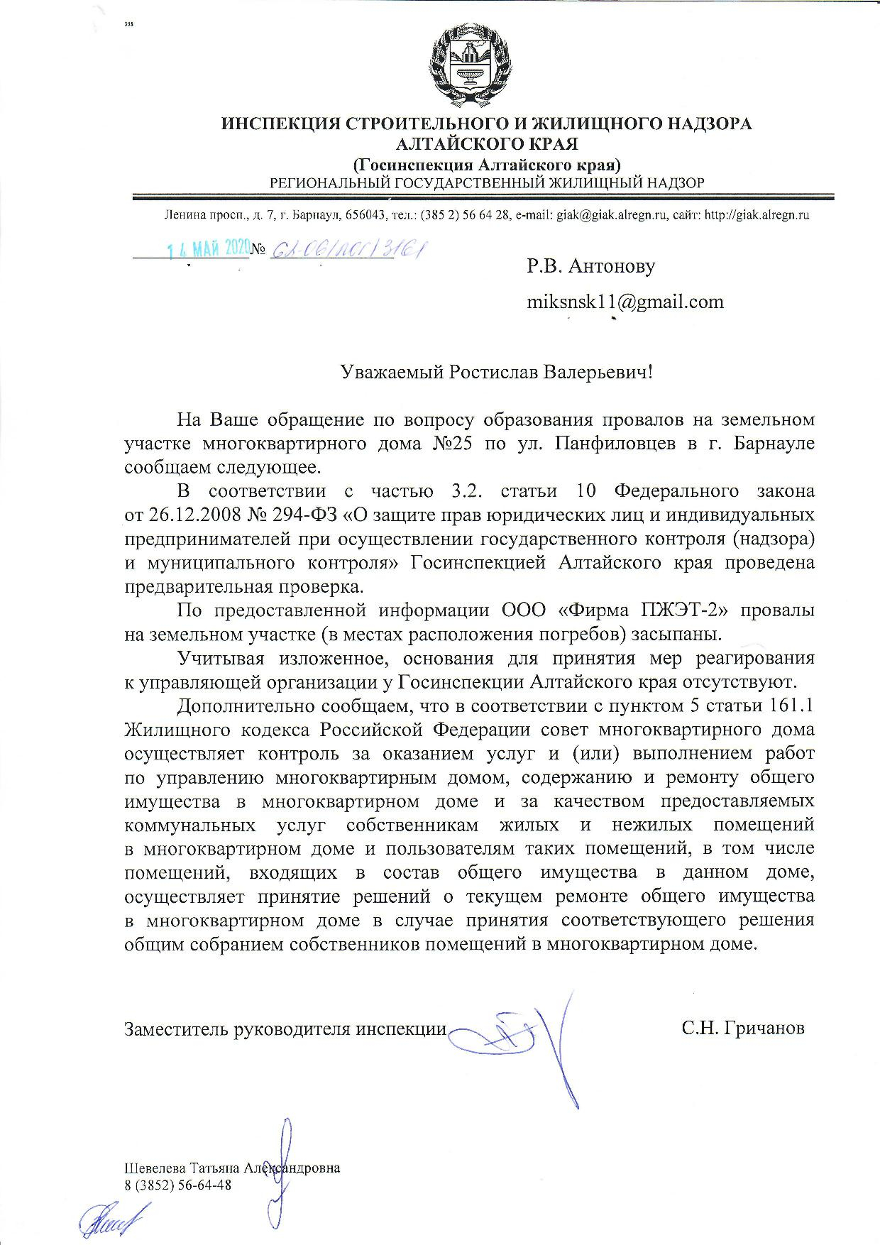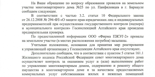 Номер жалобы:65473 Тип жалобы:Иные проблемы ЖКХ Название объекта: Регион:Алтайский край Город:Барнаул Адрес:улица Панфиловцев, 25 Описание жалобы:Во дворе огромные ямы, проваливаются заброшенные погреба.