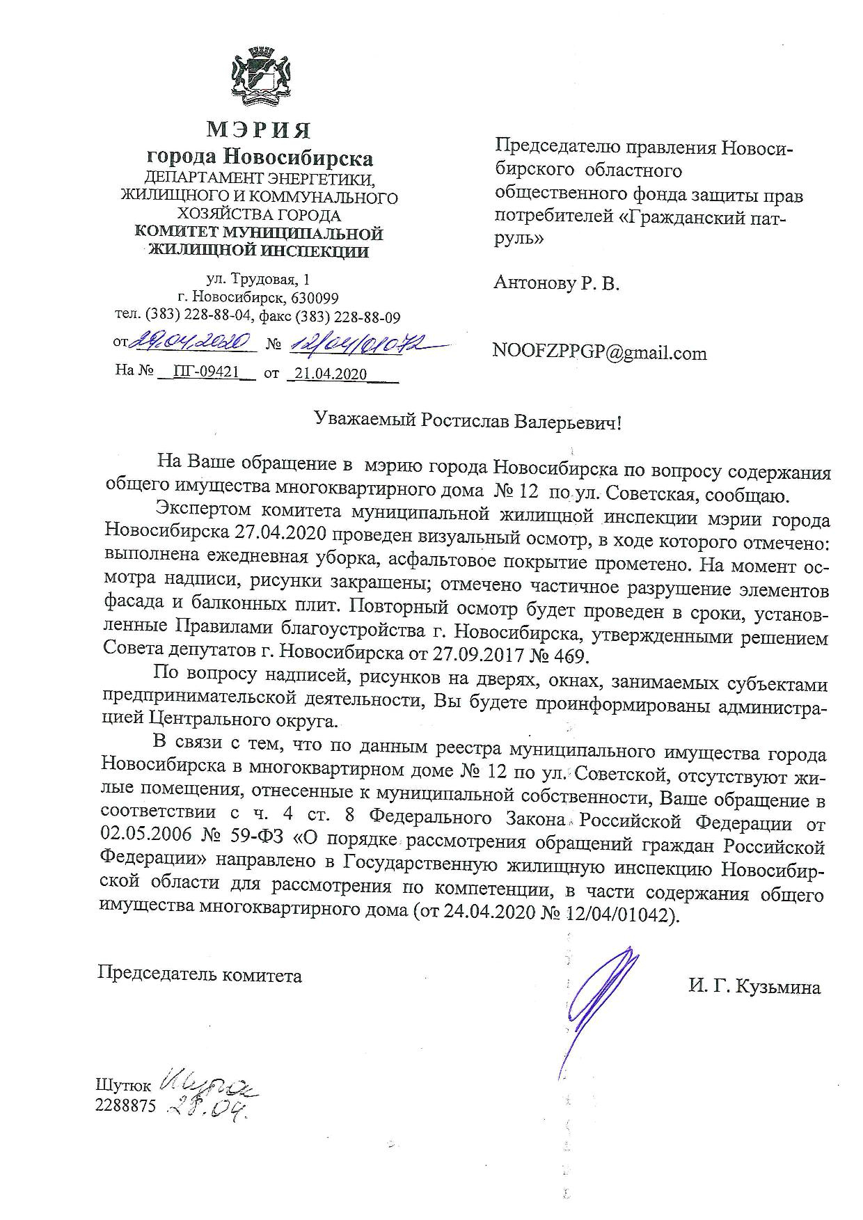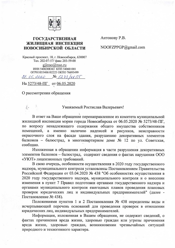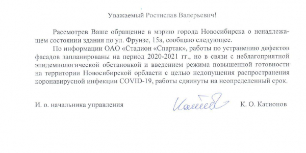 Номер жалобы:65504 Тип жалобы:Ненадлежащее содержание фасада строения, здания, сооружения Название объекта: Регион:Новосибирская область Город:Новосибирск Адрес:улица Фрунзе, 15А Описание жалобы:разрушение отделки здания, осыпается покраска, видна кирпичная кладка стен, отваливается отделка нижней части здания, выступов и балюстрады на крыше здания (перила). также присутствуют надписи на стенах. а также неудовлетворительное состояние парапетов газонов перед зданием - отваливается отделка, разрушается кирпичная кладка.