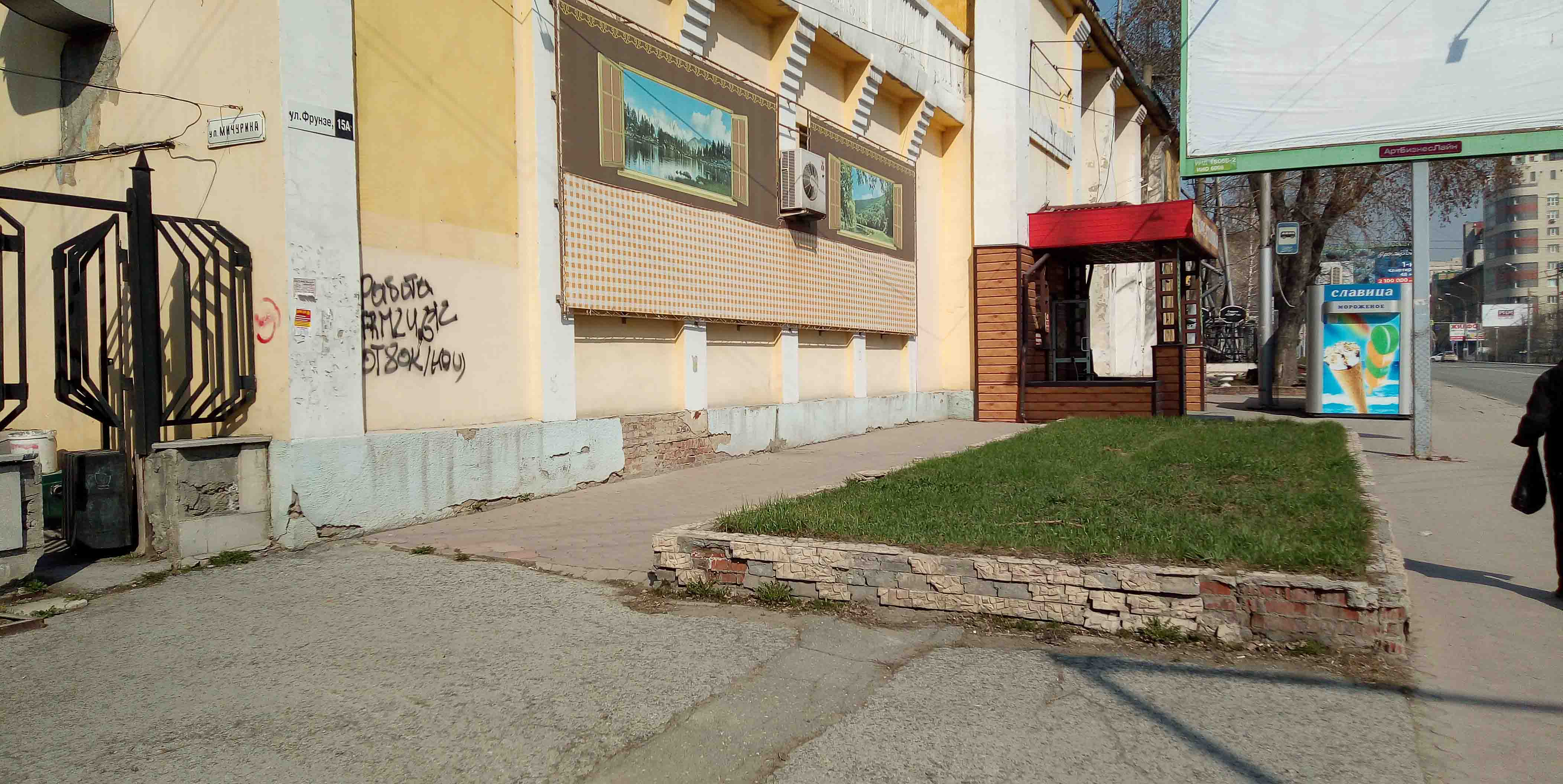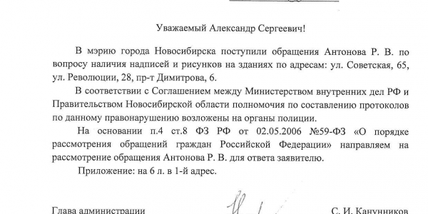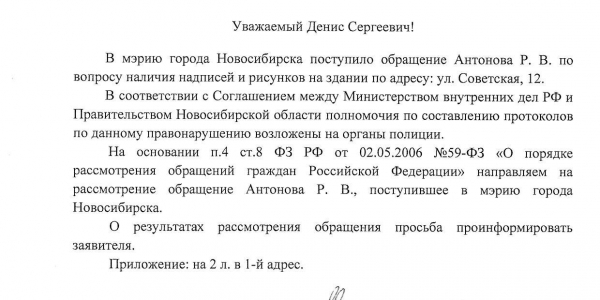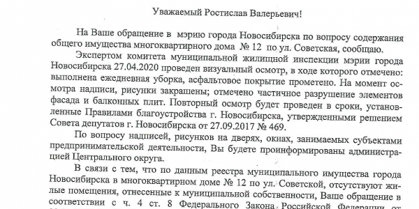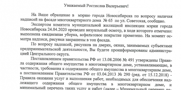 Номер жалобы:65484 Тип жалобы:Ненадлежащее содержание фасада строения, здания, сооружения Название объекта: Регион:Новосибирская область Город:Новосибирск Адрес:Советская, 65 Описание жалобы:снова надписи на доме, а также закраска предыдущих надписей не в тон цвета здания. это нарушение правил благоустройства города. а также надписи на дверях возле магазина "Тонкости вкуса", что со стороны площади Кондратюка.