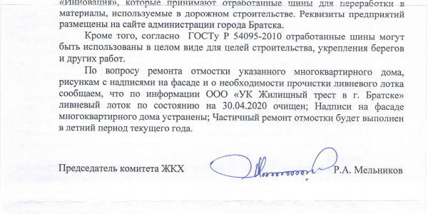 Номер жалобы:65464 Тип жалобы:Иные проблемы ЖКХ Название объекта: Регион:Иркутская область Город:Братск Адрес:улица Малышева, 4 Описание жалобы:Разрушение отмостки, отходы опасного класса (б/у покрышки) используются в качестве клумб, рисунки с надписями на фасаде, необходима прочистка ливневого лотка Статус: