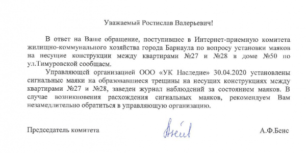 Номер жалобы:65469 Тип жалобы:Иные проблемы ЖКХ Название объекта: Регион:Алтайский край Город:Барнаул Адрес:Тимуровская улица, 50 Описание жалобы:Дом на Тимуровской, 50 признан аварийным.