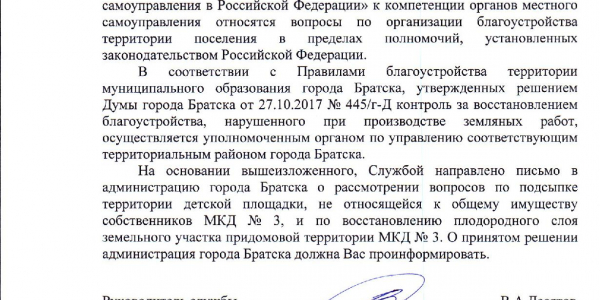 Номер жалобы:65436 Тип жалобы:Иные проблемы ЖКХ Название объекта: Регион:Иркутская область Город:Братск Адрес:улица Возрождения, 3 Описание жалобы:Детская площадка ниже уровня территории, как следствие - скопление воды. Отсутствует подсыпка Статус: