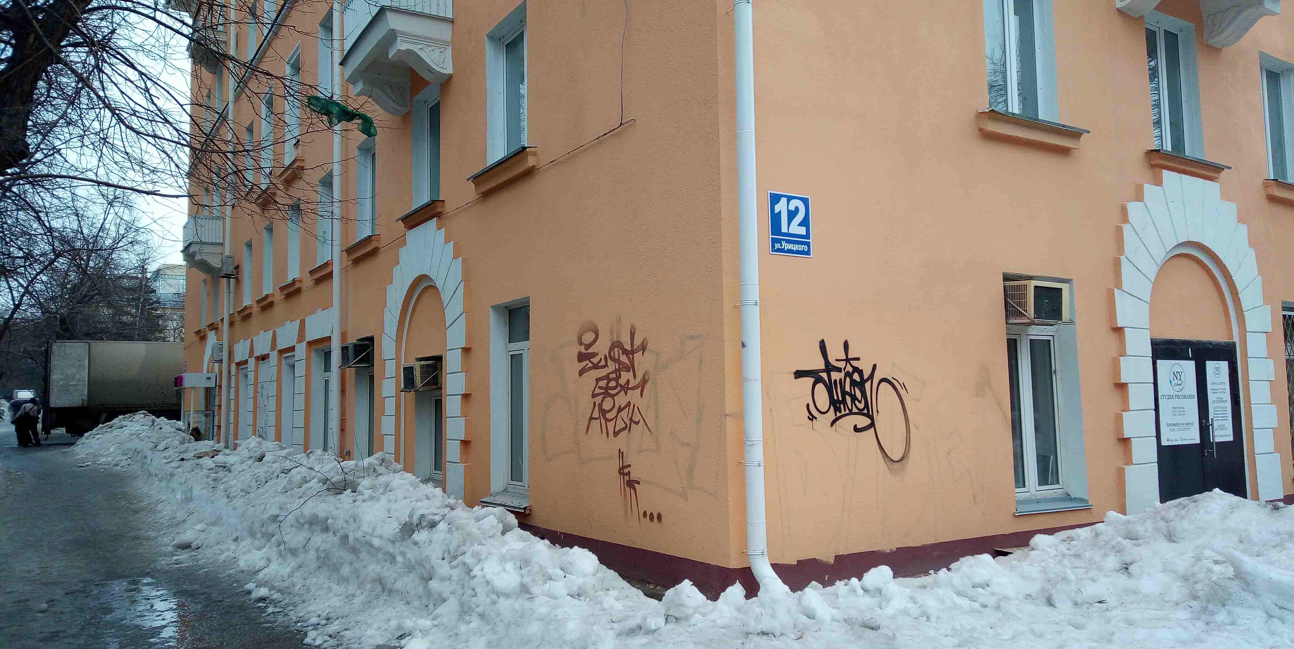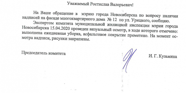 Номер жалобы:65225 Тип жалобы:Ненадлежащее содержание фасада строения, здания, сооружения Название объекта: Регион:Новосибирская область Город:Новосибирск Адрес:улица Урицкого, 12 Описание жалобы:Урицкого 12 и Максима Горького 32. надписи на стенах дома Статус: