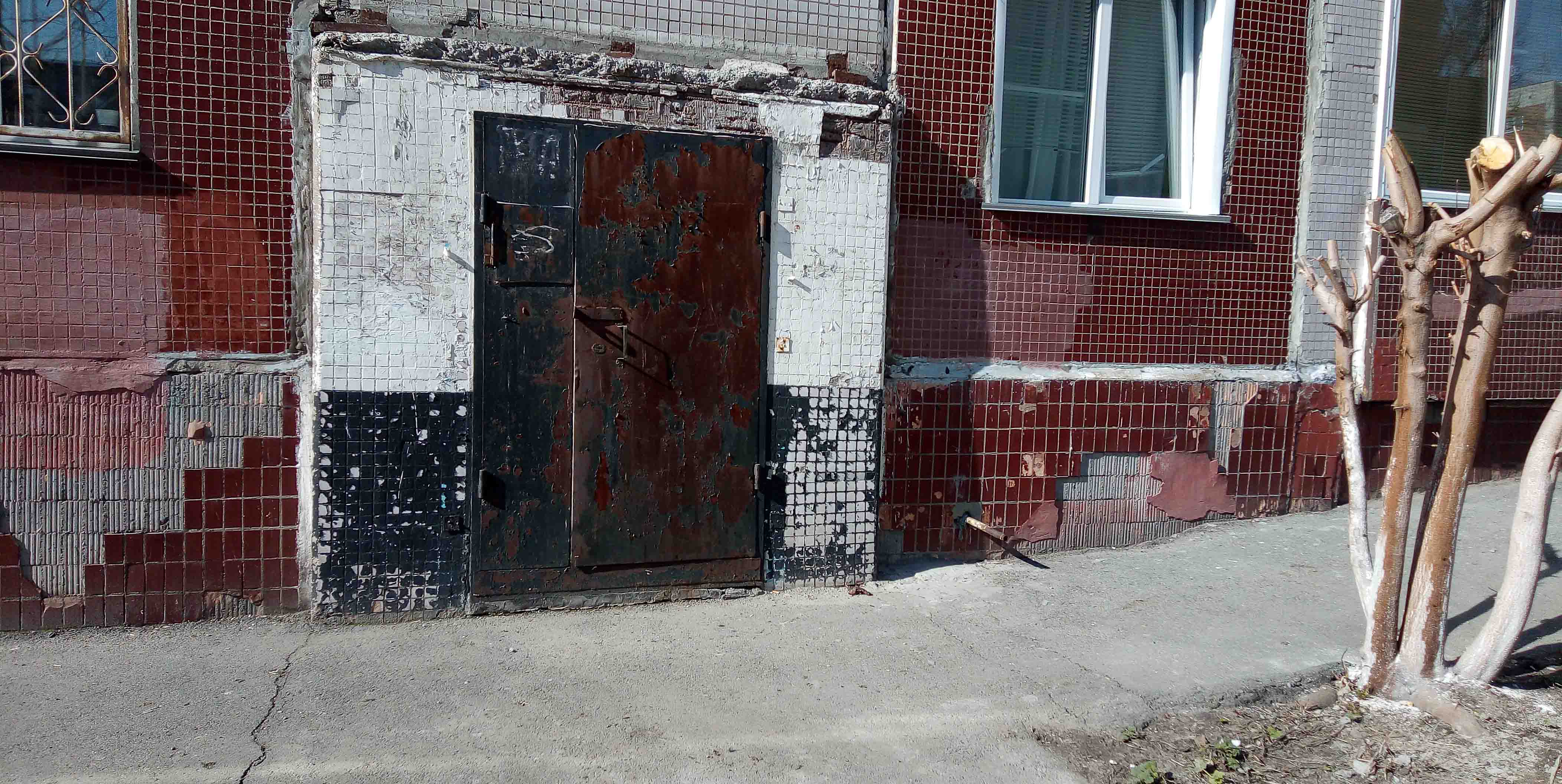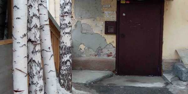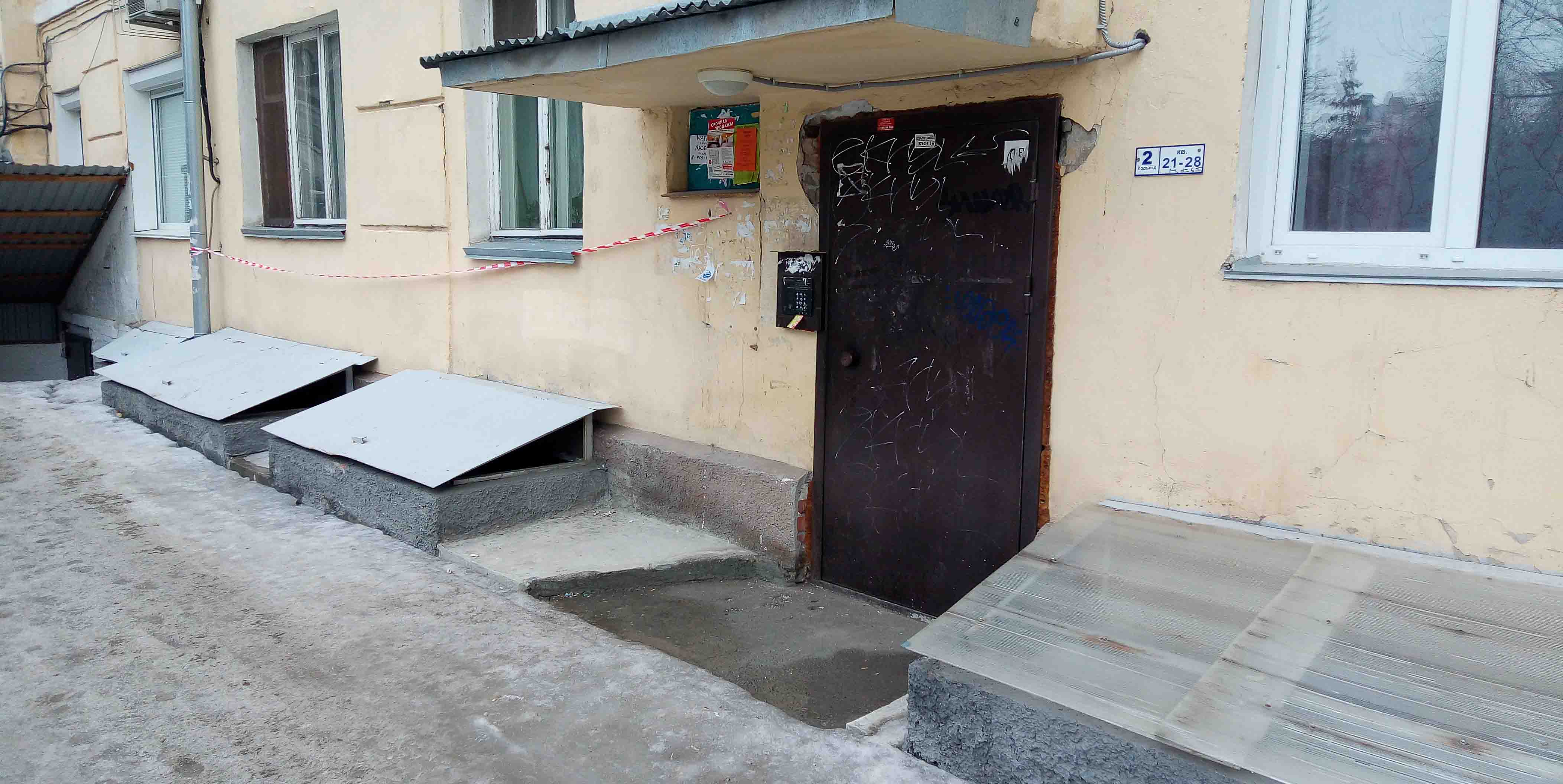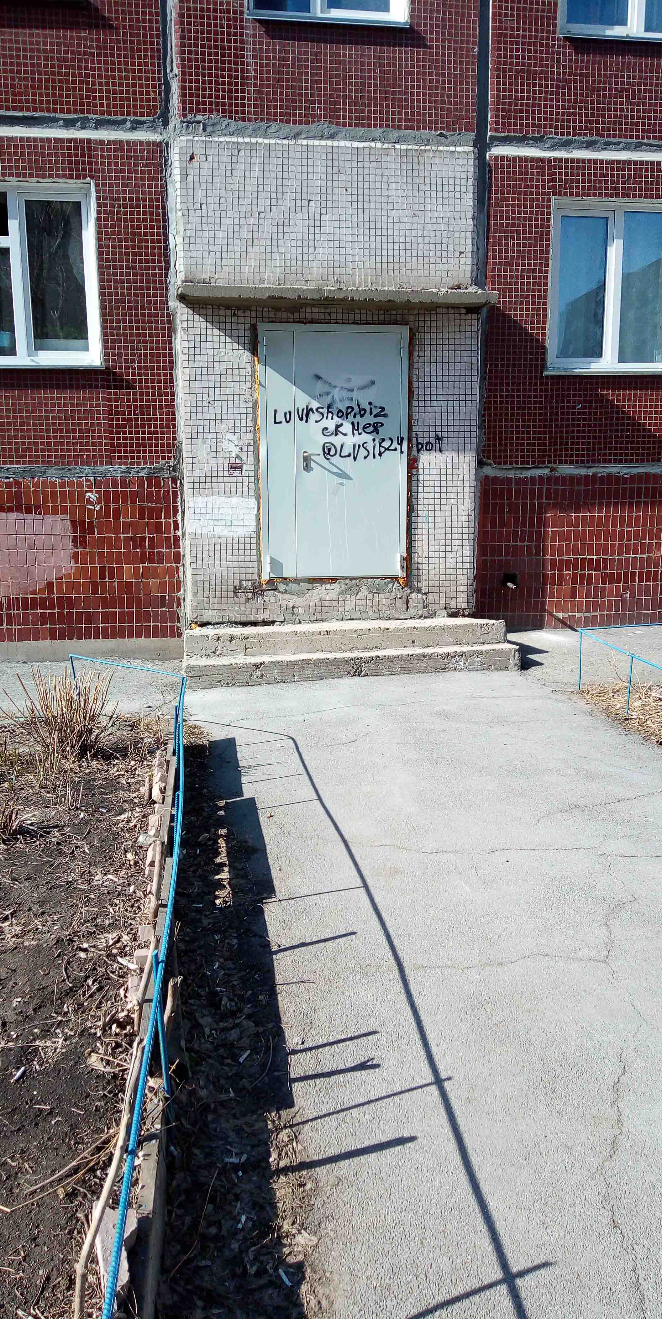 надписи на дверях подъездов. некоторые двери облезшие и ржавеют.