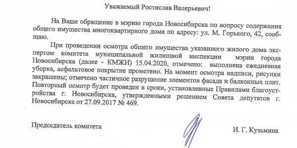 Номер жалобы:65224 Тип жалобы:Ненадлежащее содержание фасада строения, здания, сооружения Название объекта: Регион:Новосибирская область Город:Новосибирск Адрес:Чаплыгина, 39 Описание жалобы: ГИС ЖКХ "тихий центр", уютное место и вот такой страшный дом. покраска дома облезла, осыпается отделка карнизов крыши, внешние стены подъездов нуждаются в покраске, двери в надписях, над козырьками подъездов осыпается отделка, проблемы с отмосткой дома Статус: