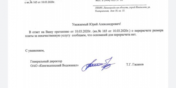 Номер жалобы:65244 Тип жалобы:Иные проблемы ЖКХ Название объекта: Регион:Ленинградская область Город:Кингисепп Адрес:Кингисепп, Театральная улица, 10 Описание жалобы:Водоканал оказывает некачественную услугу. Перерасчёт считает нет основания делать. Качество не улучшается. Дополнительно есть ответ. Роспотреб надзора жил инспекции. И главного санитарного врача. Лен обл. Статус: