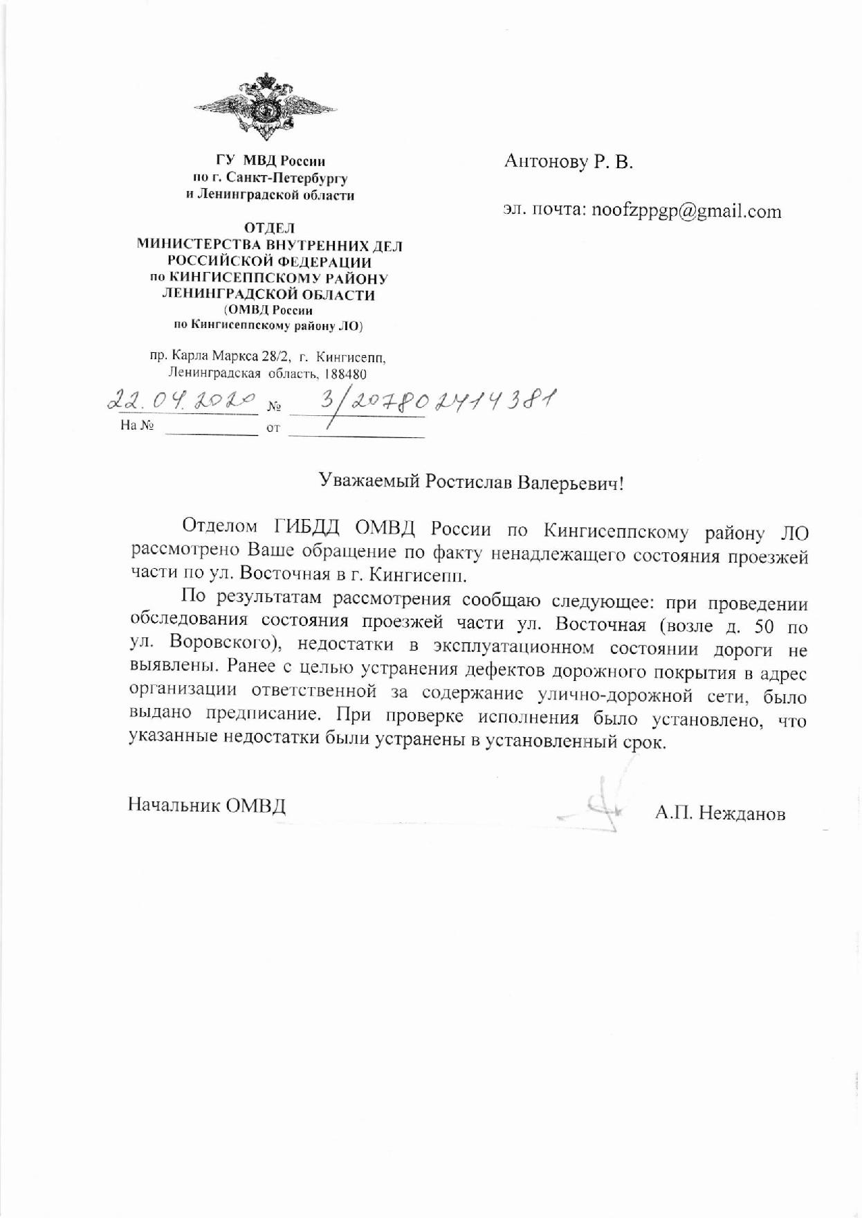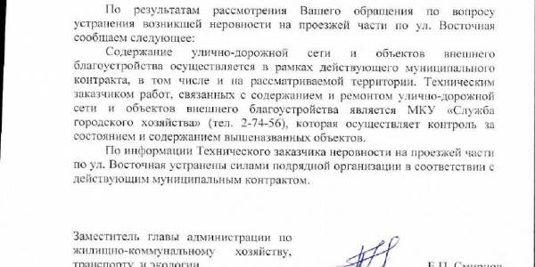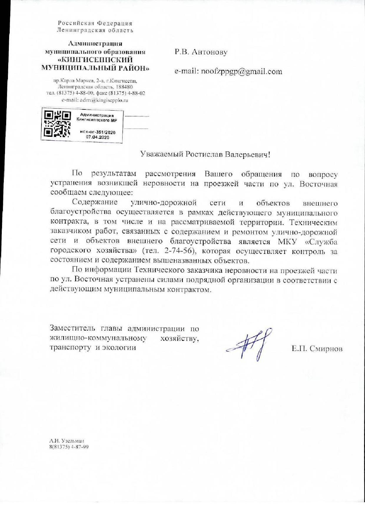 Номер жалобы:65018 Тип жалобы:Иные проблемы ЖКХ Название объекта: Регион:Ленинградская область Город:Кингисепп Адрес:Восточная улица Описание жалобы:Коварная яма Находится между ул. Восточной и жк Ямбург Статус: