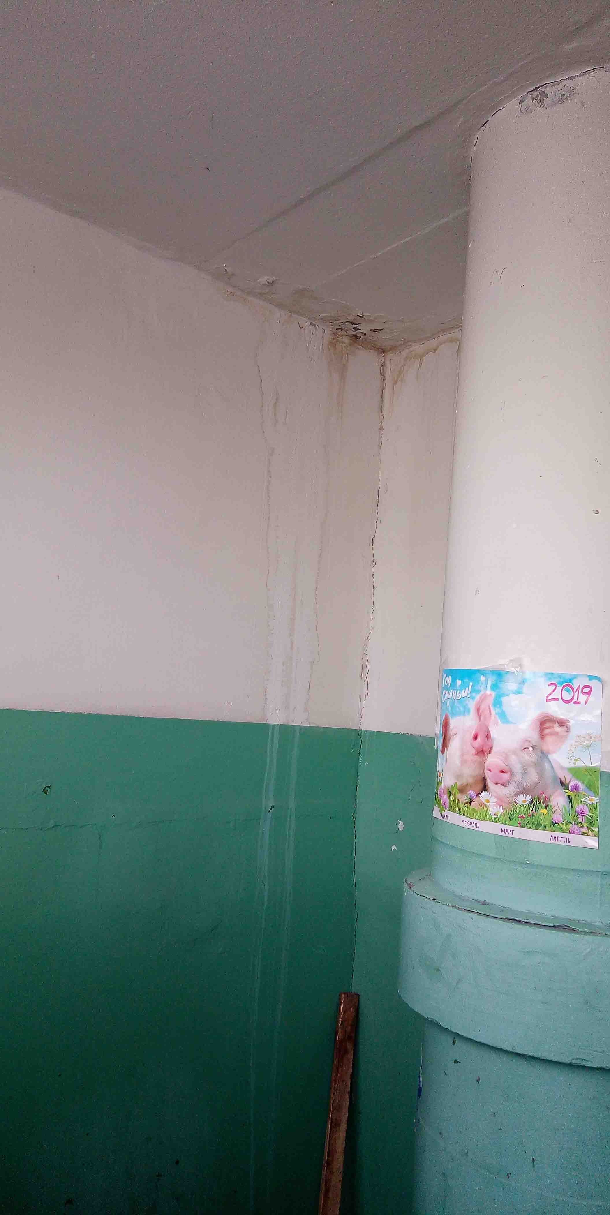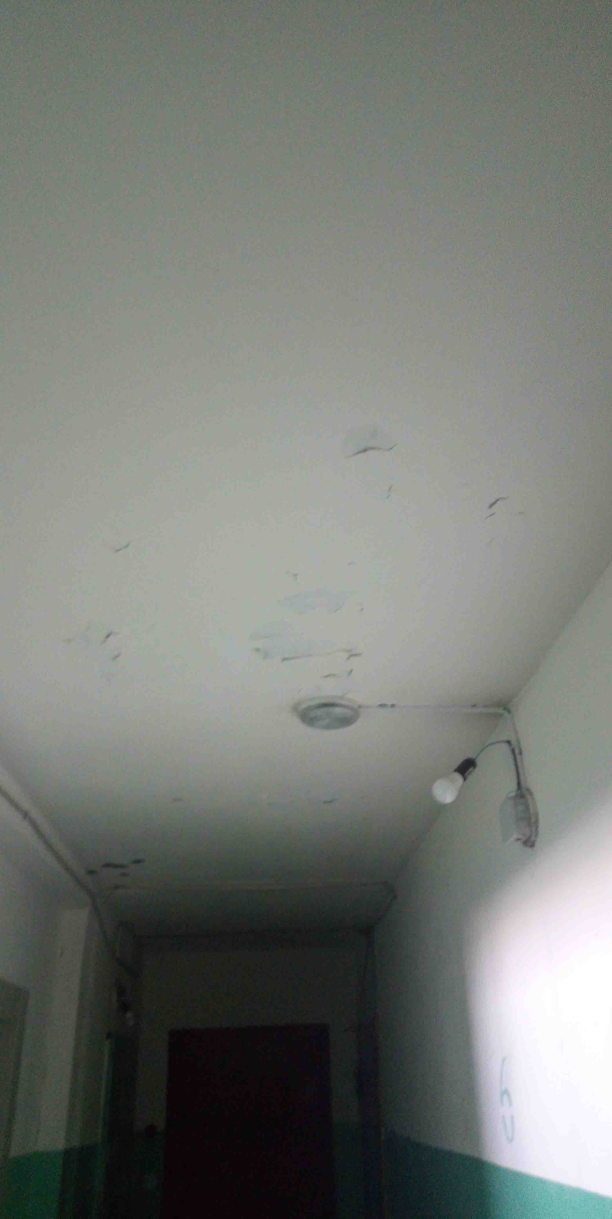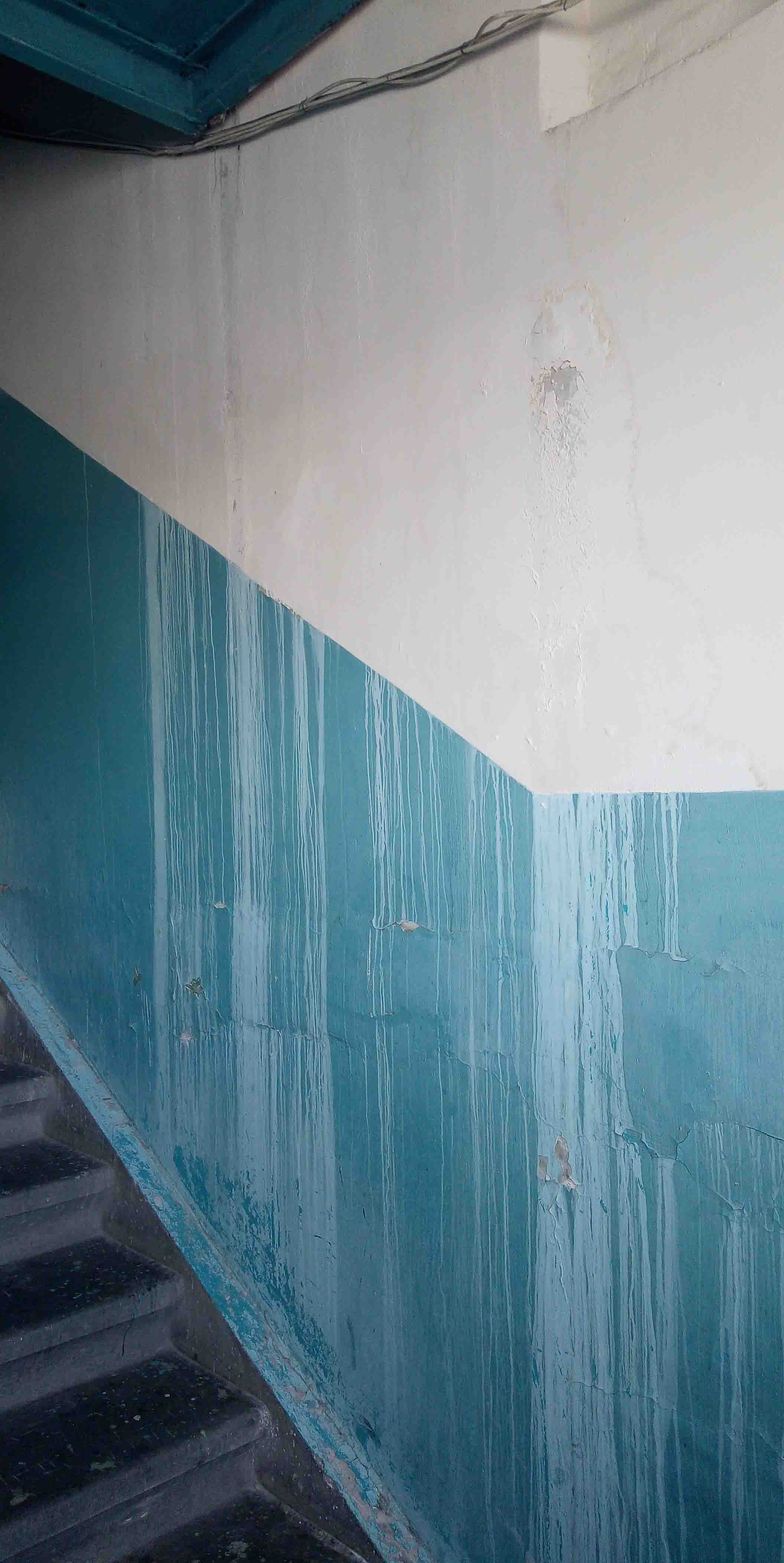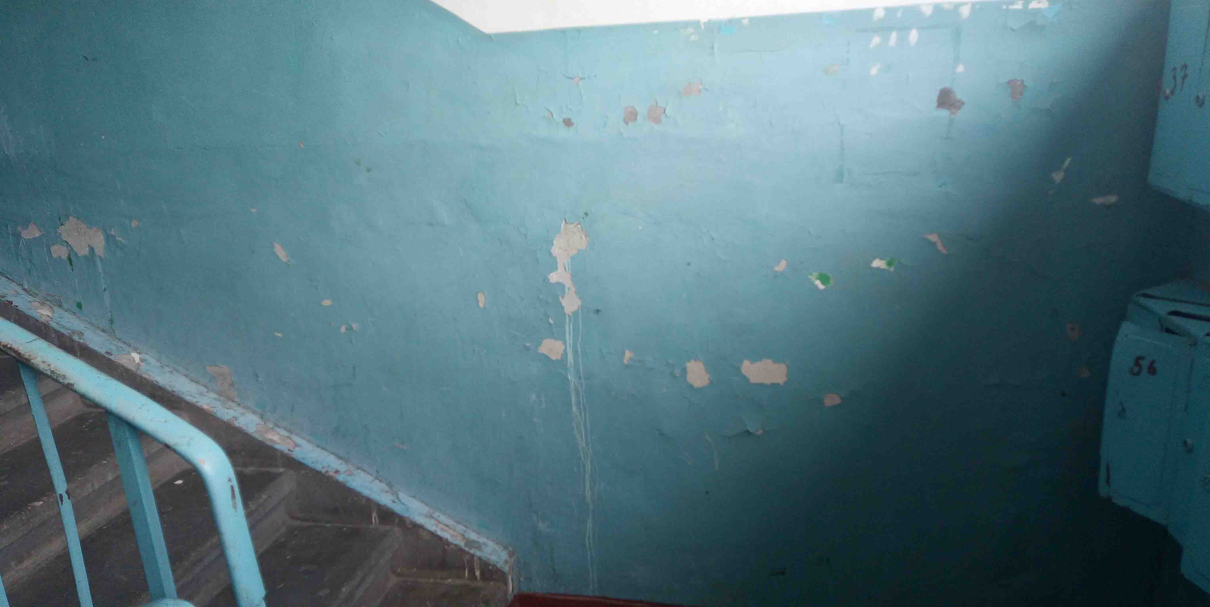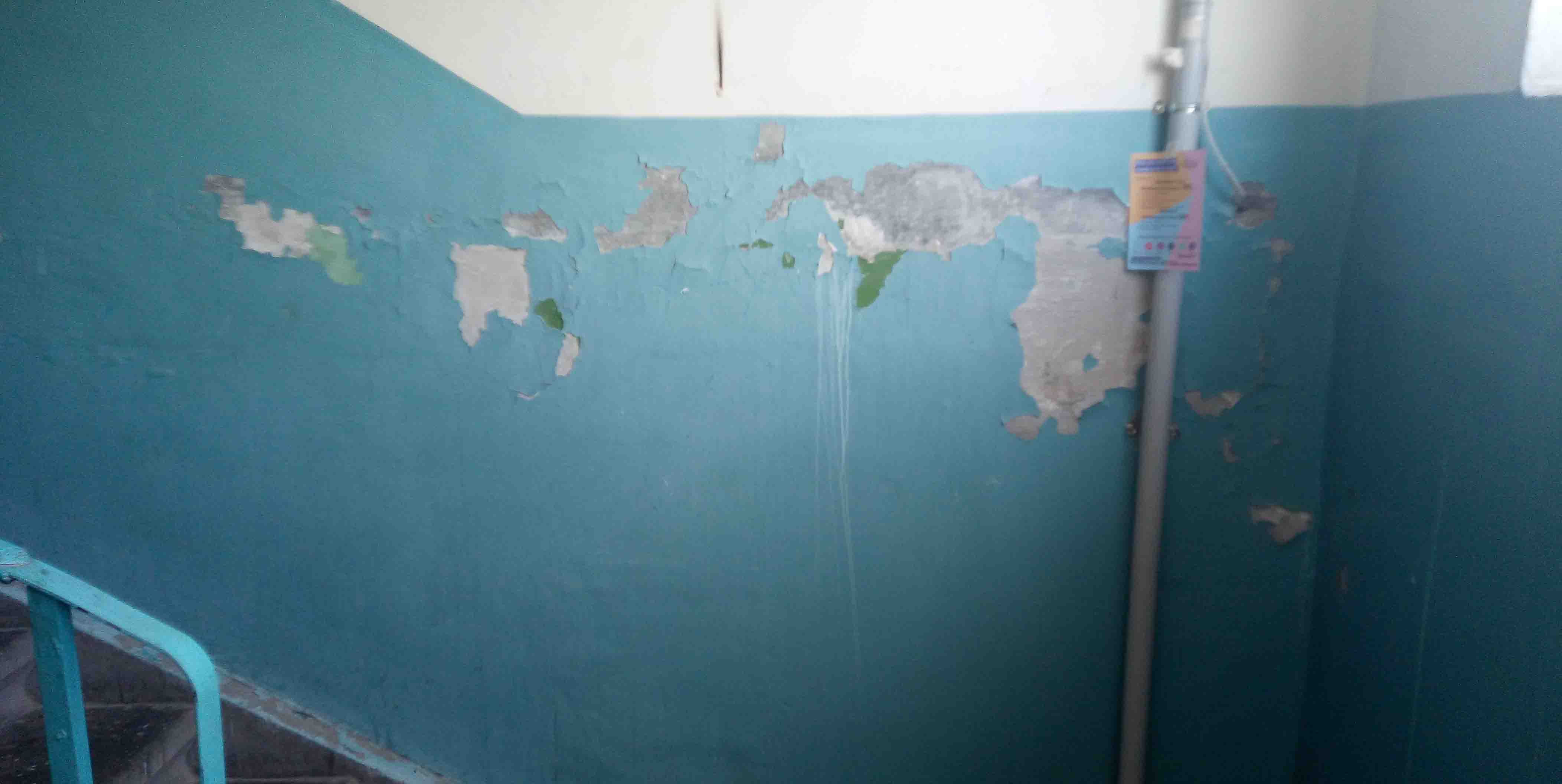 осыпается потолок на 9 этаже, виден грибок. с 9 по 5 или 6 этаж странные следы протекания по стене, белого цвета.