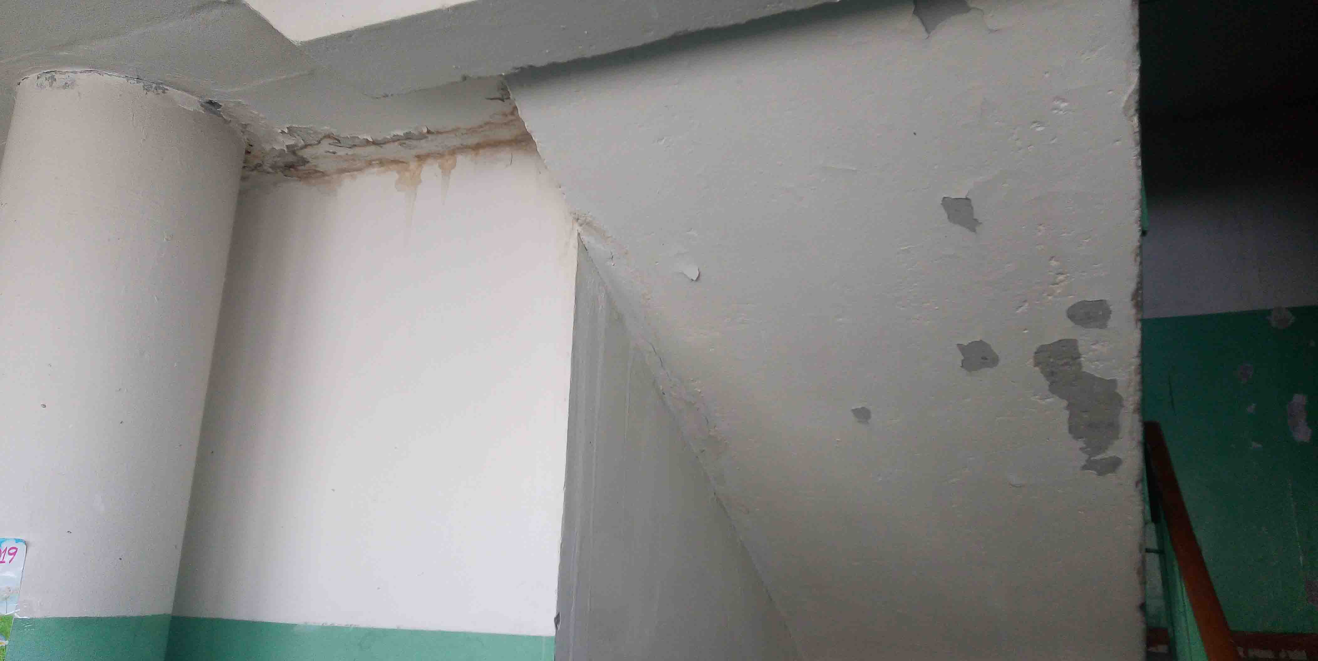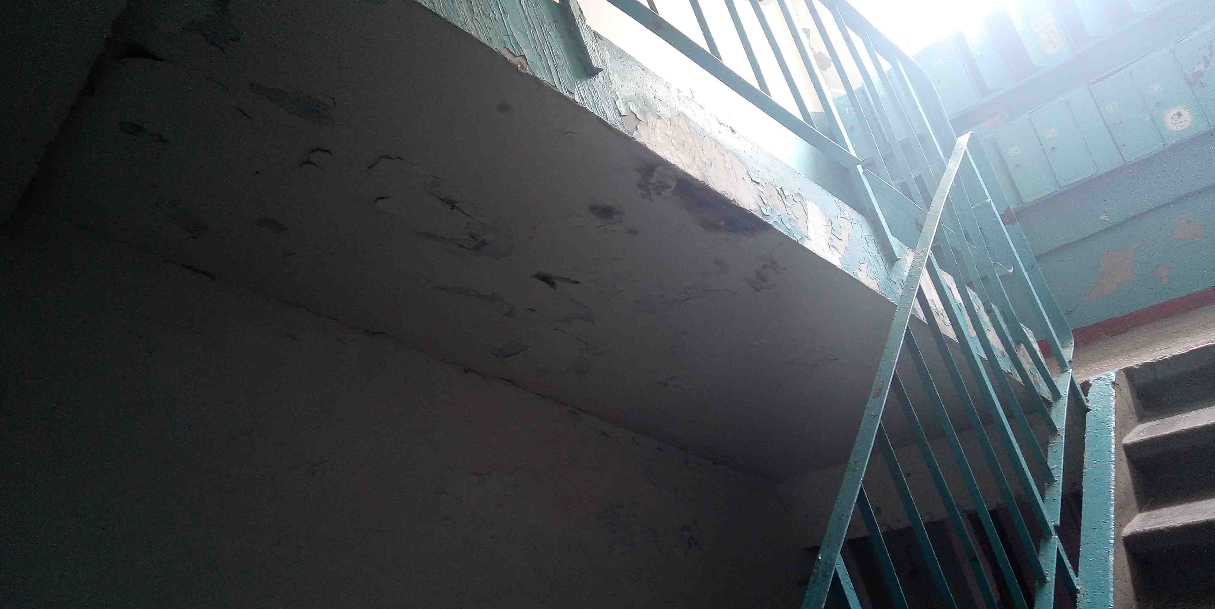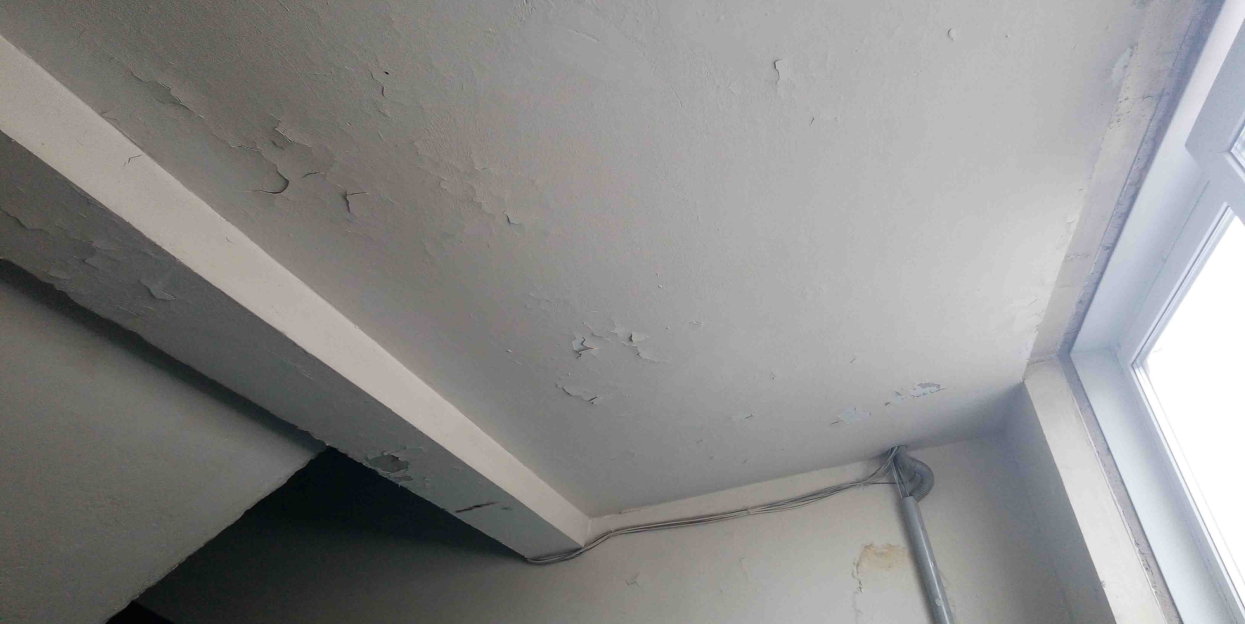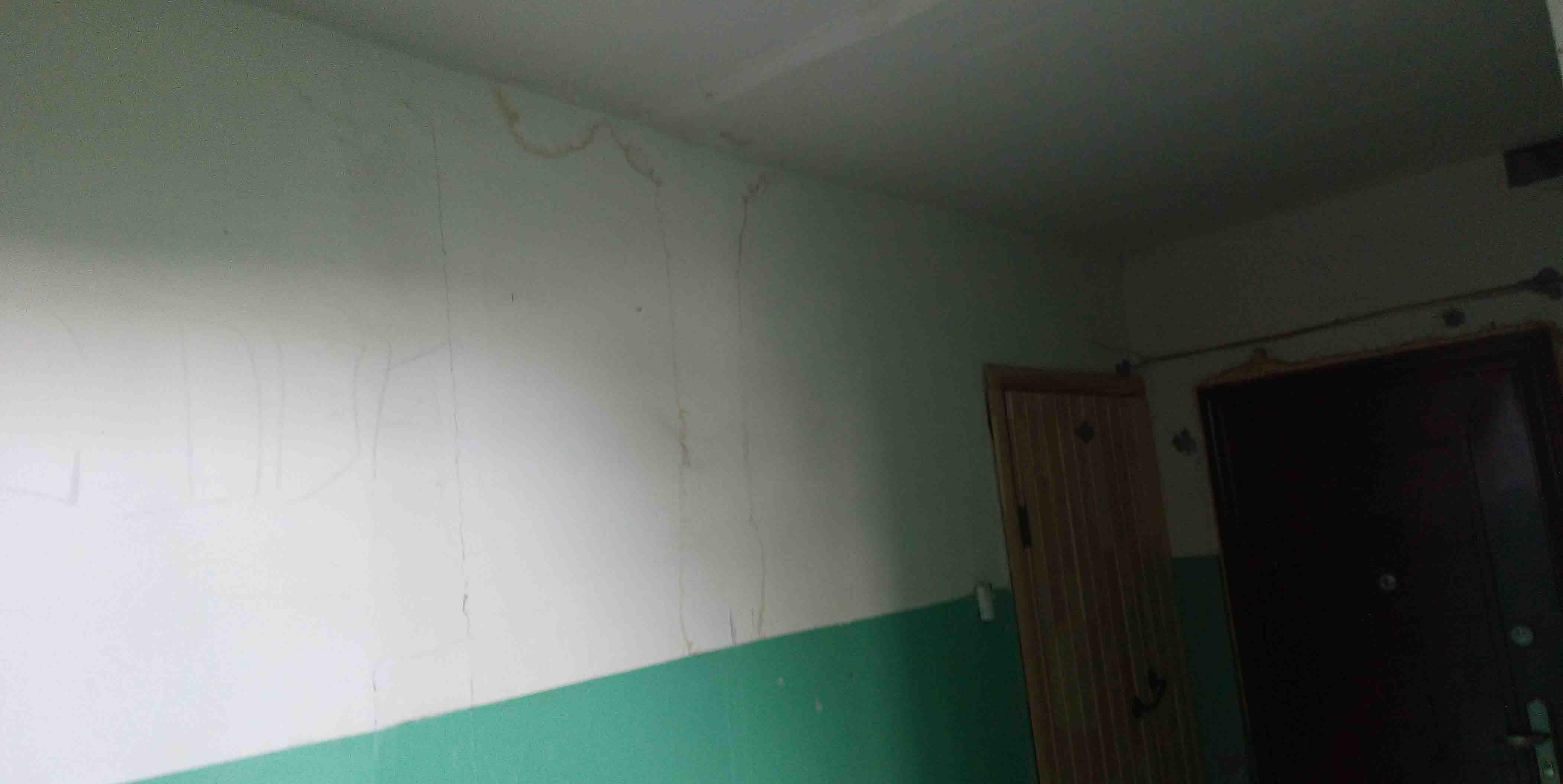 осыпается потолок на 9 этаже, виден грибок. с 9 по 5 или 6 этаж странные следы протекания по стене, белого цвета.
