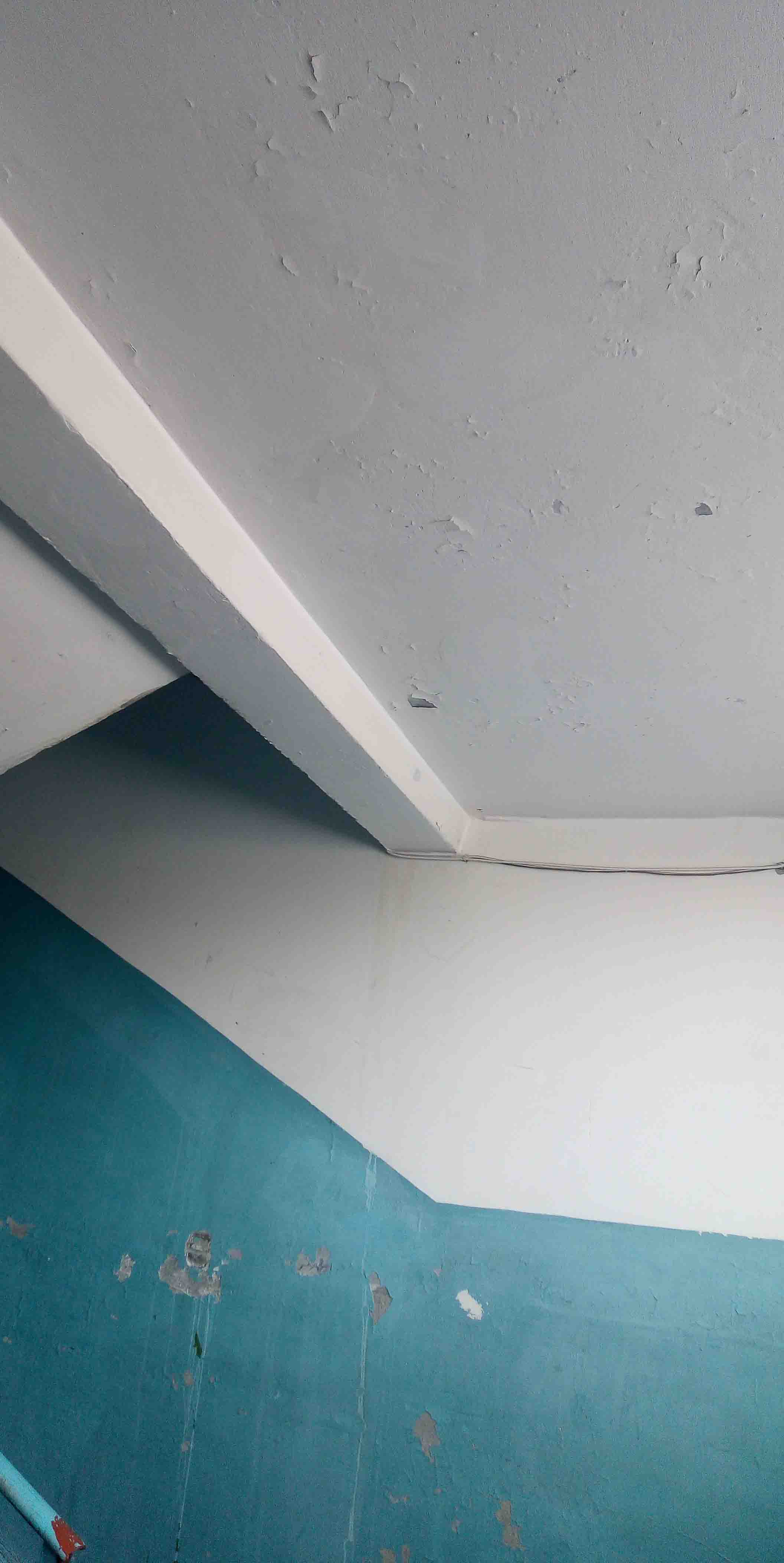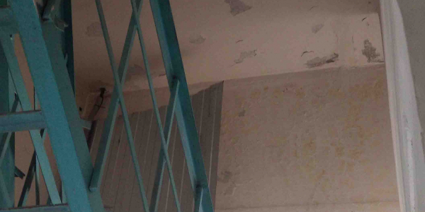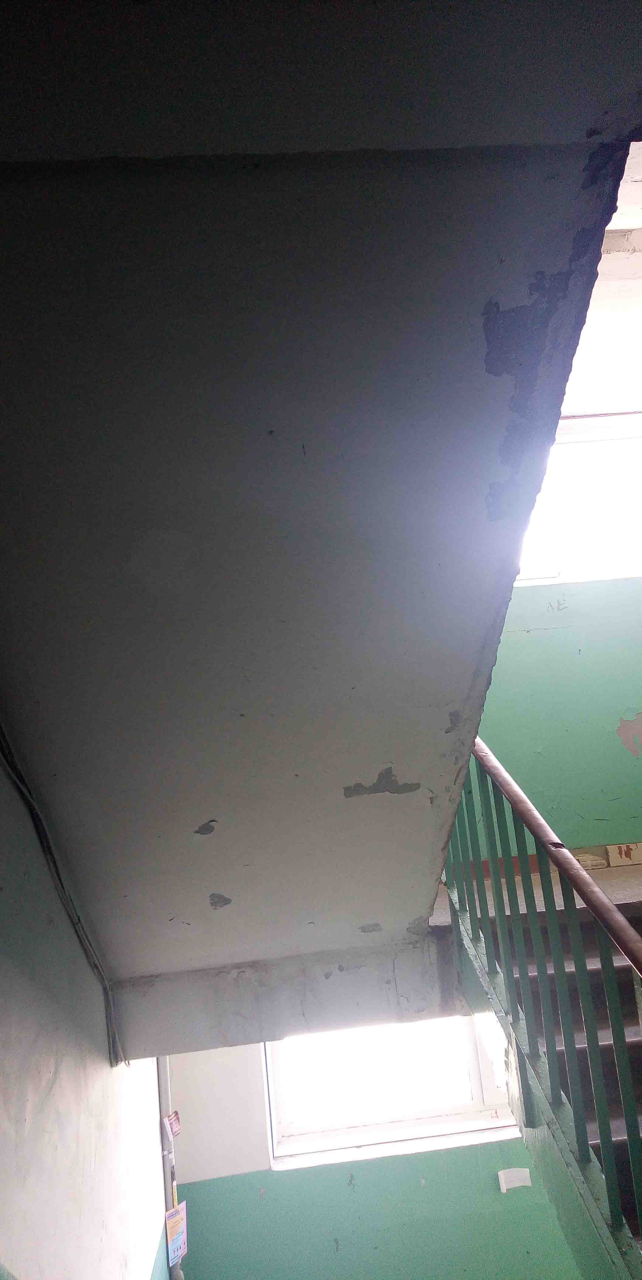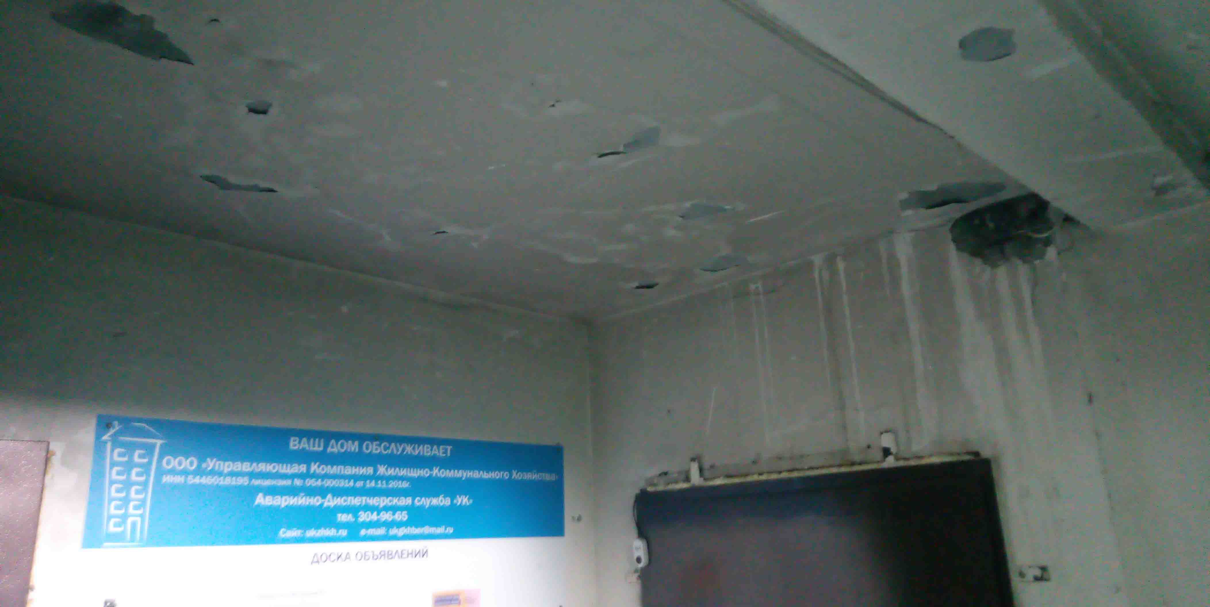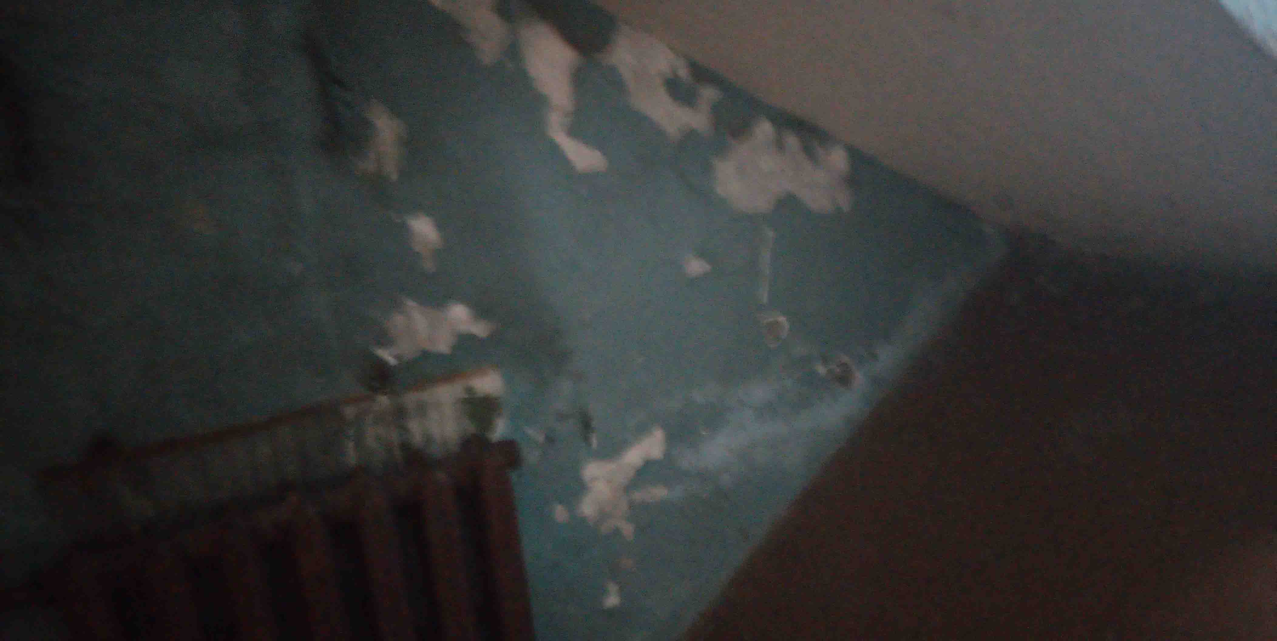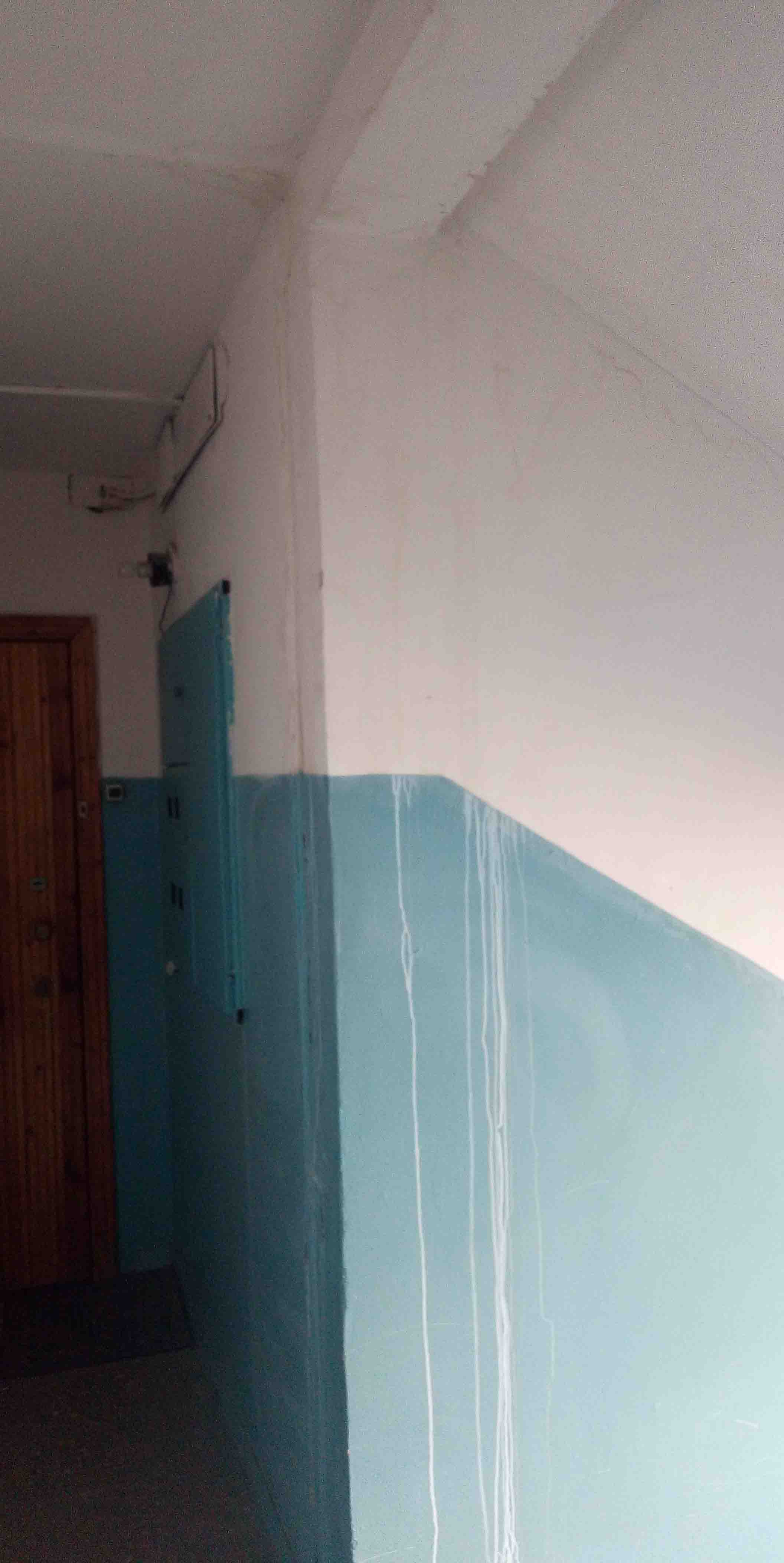 осыпается потолок на 9 этаже, виден грибок. с 9 по 5 или 6 этаж странные следы протекания по стене, белого цвета.