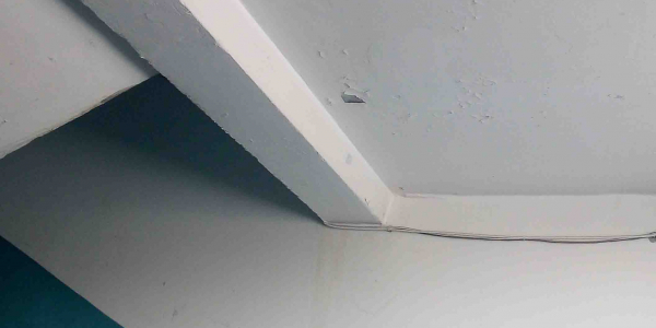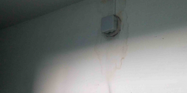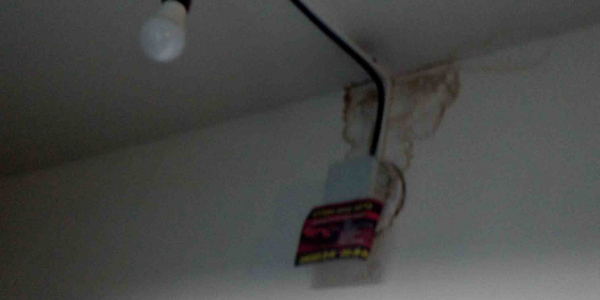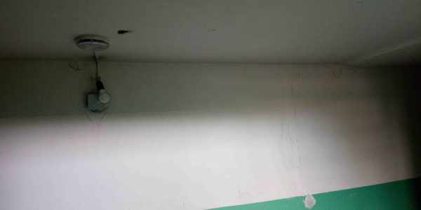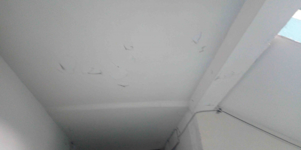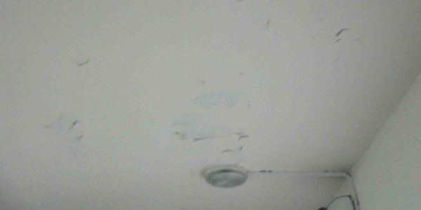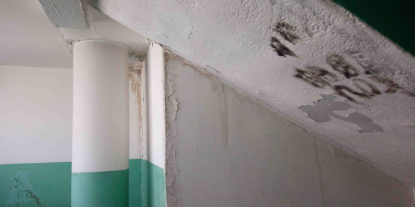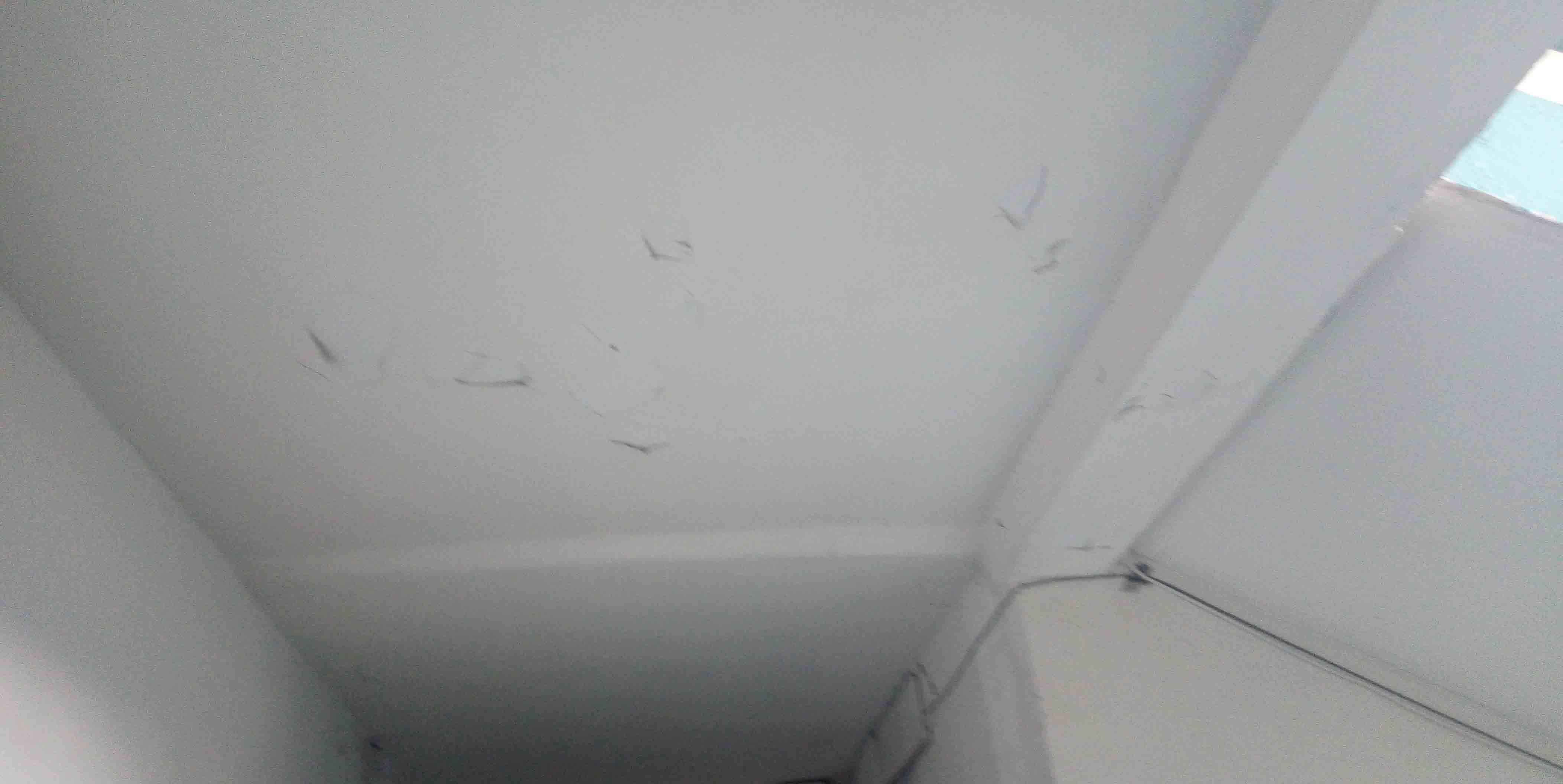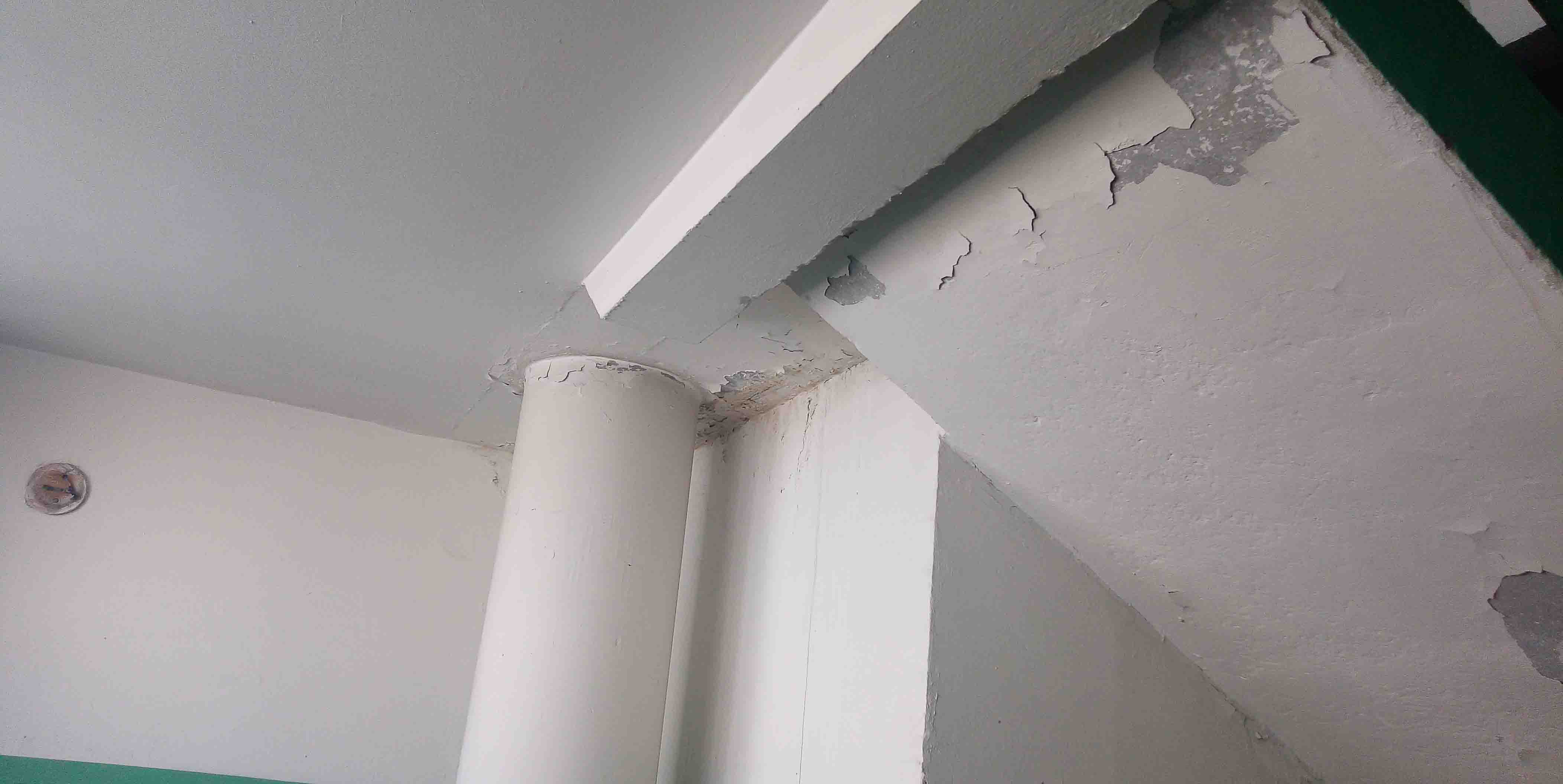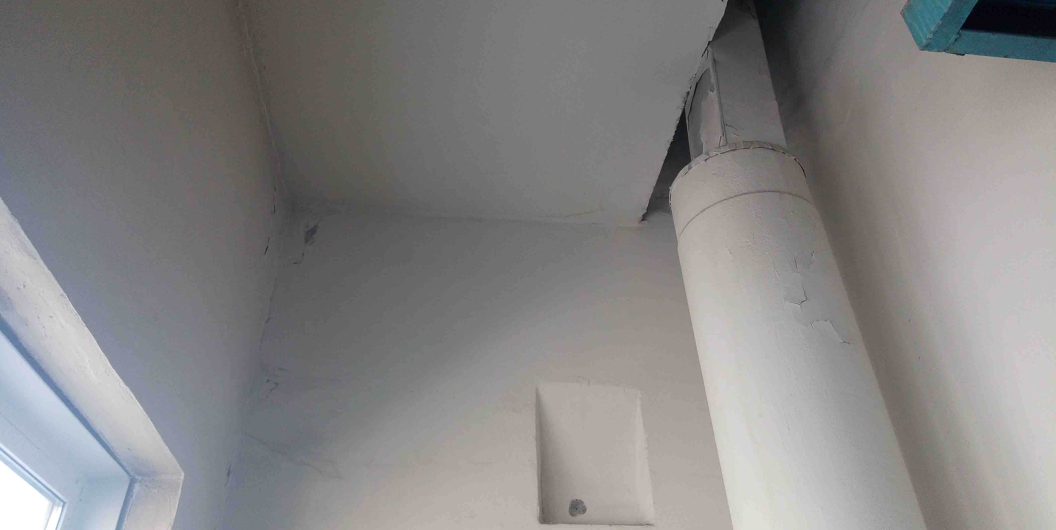 осыпается потолок на 9 этаже, виден грибок. с 9 по 5 или 6 этаж странные следы протекания по стене, белого цвета.