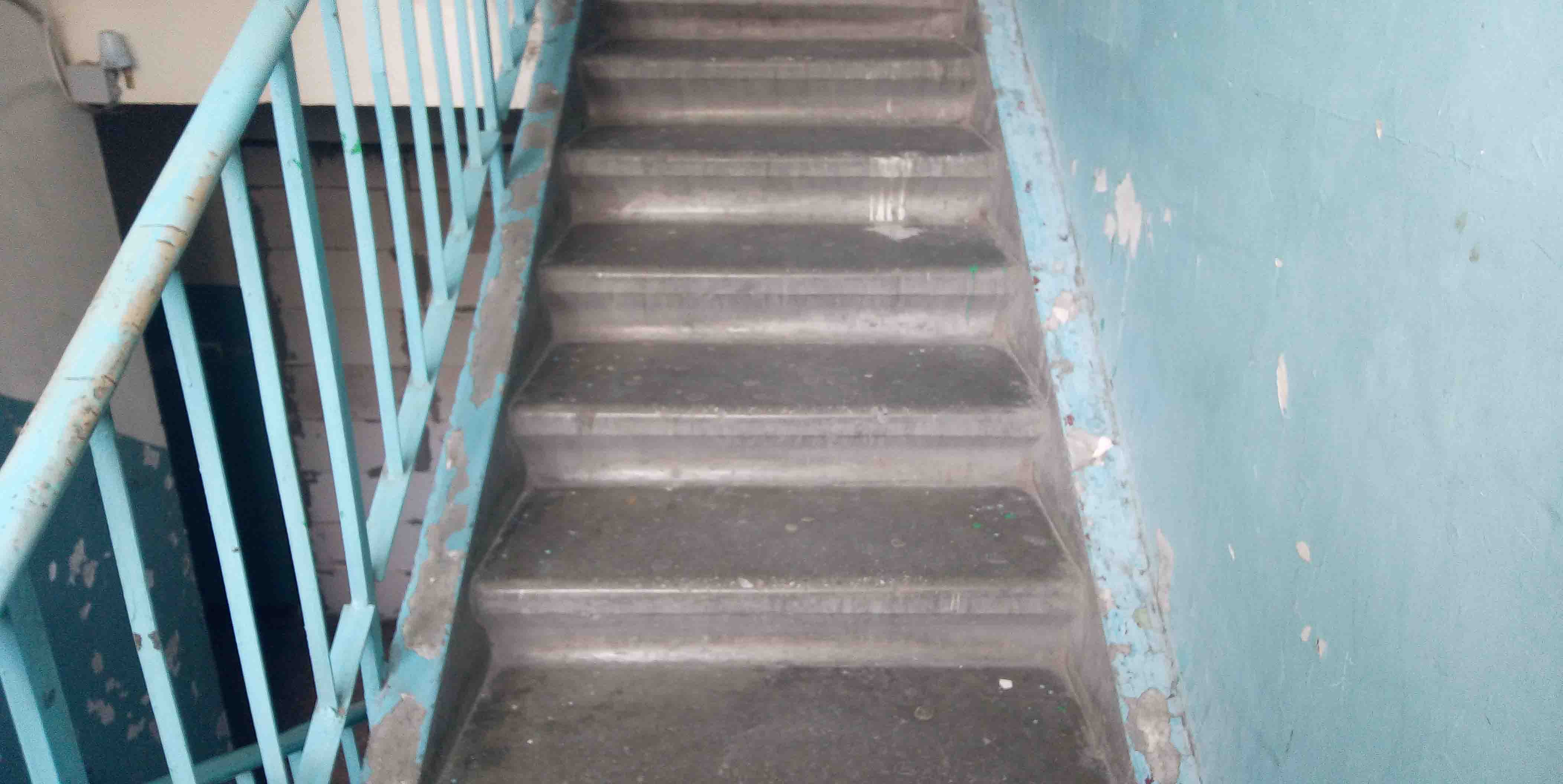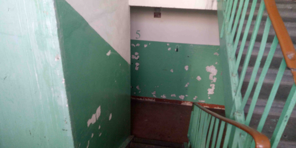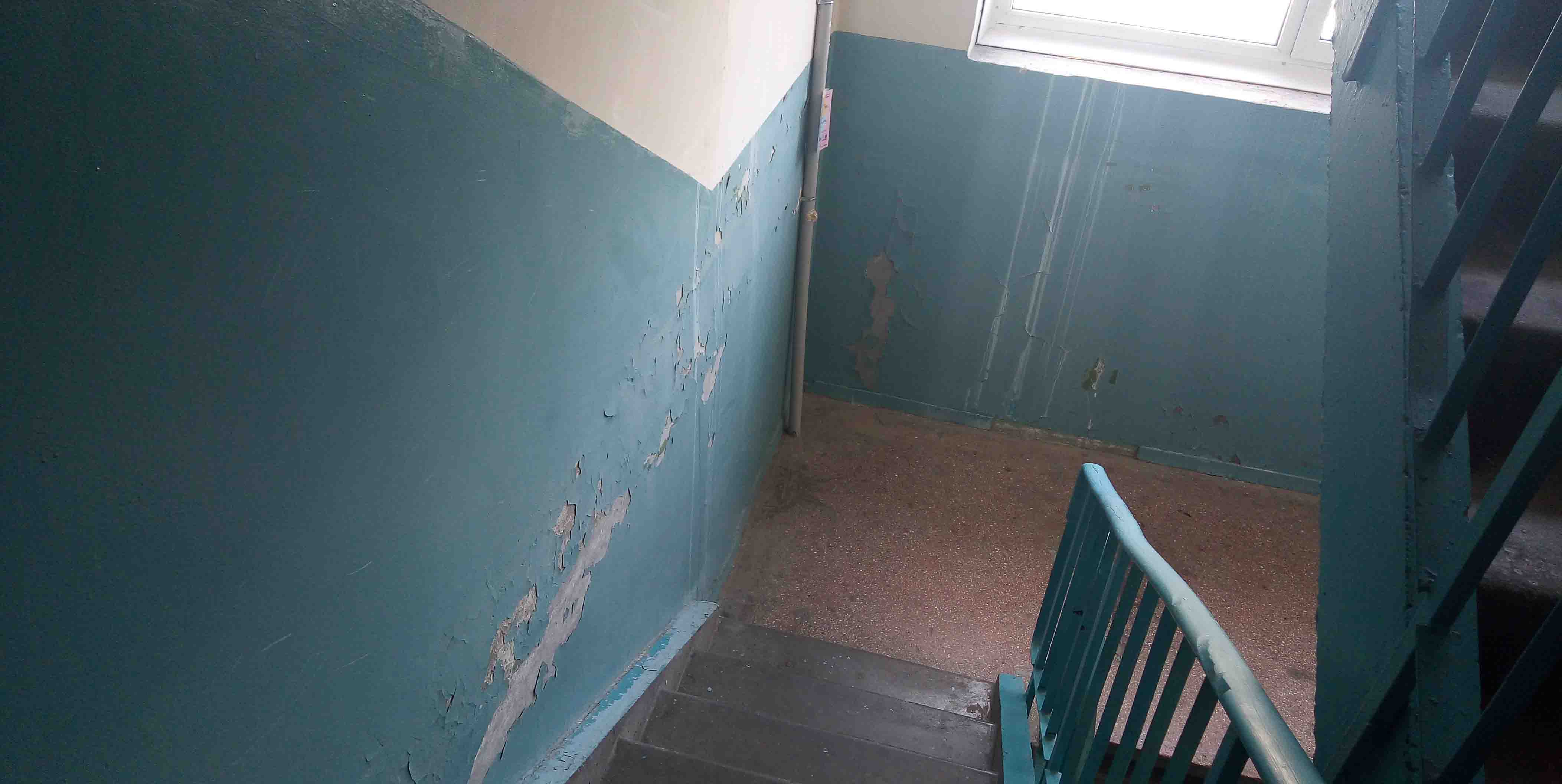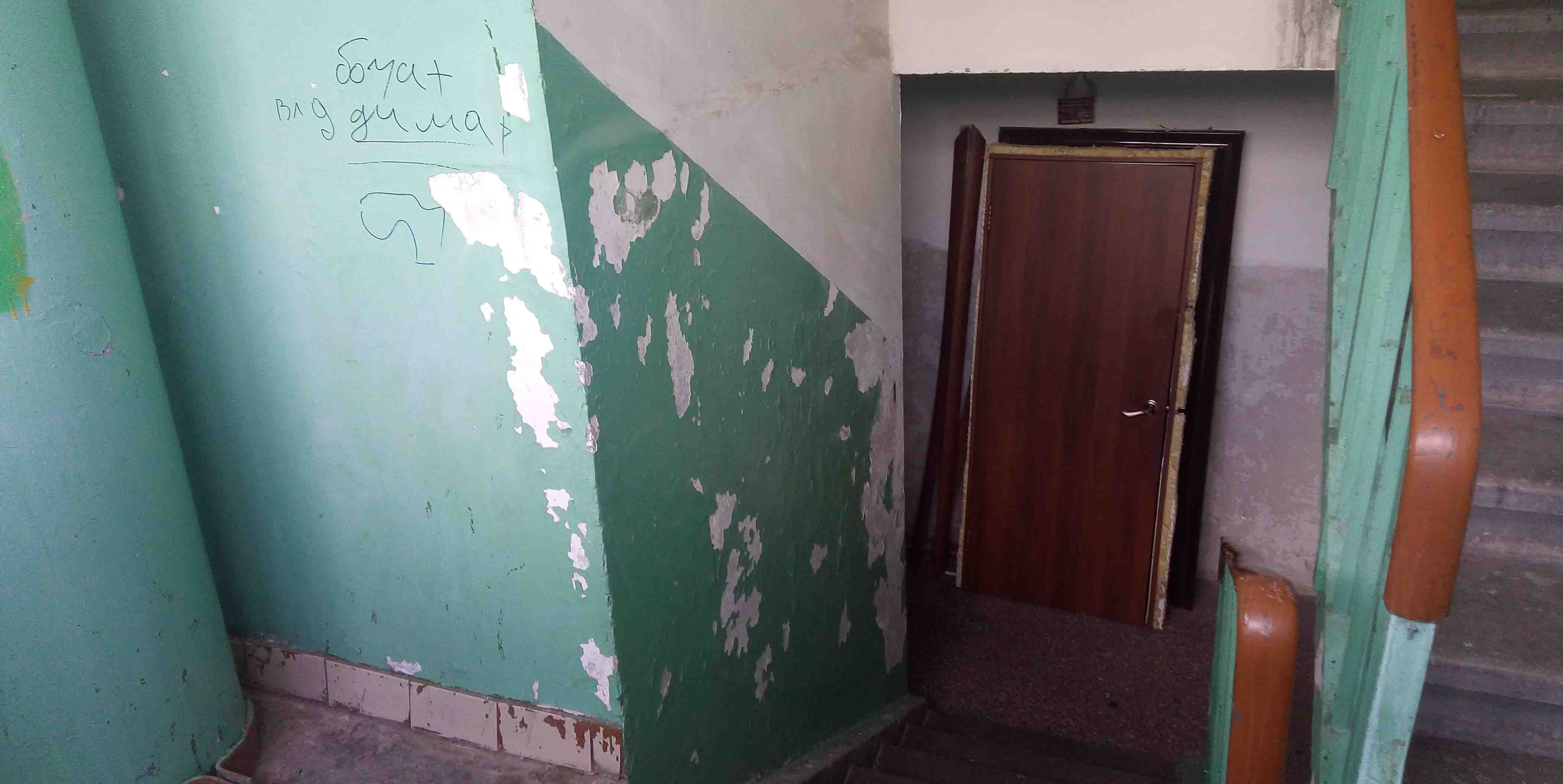 на стенах присутствуют надписи. много следов подтеков по этажам, особенно в районе электрокоробочек и мусорной шахты.облезшие лестницы и лестничные марши, как с лицевой стороны, так и с обратной.