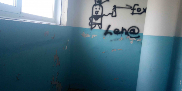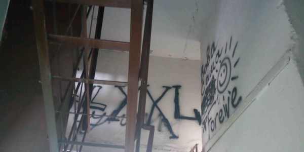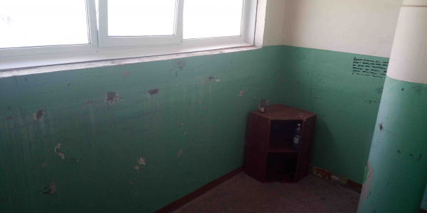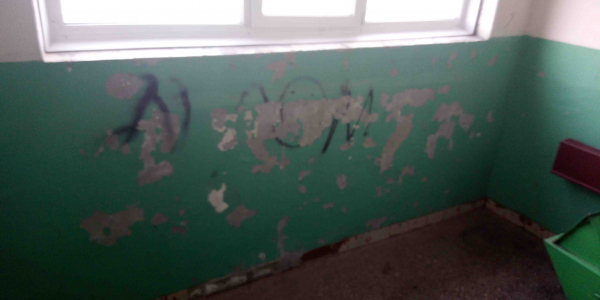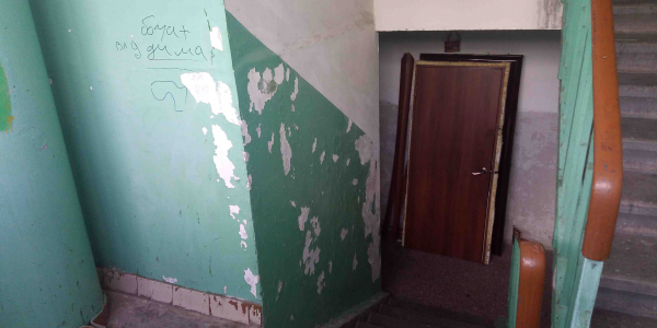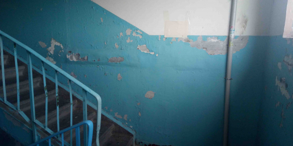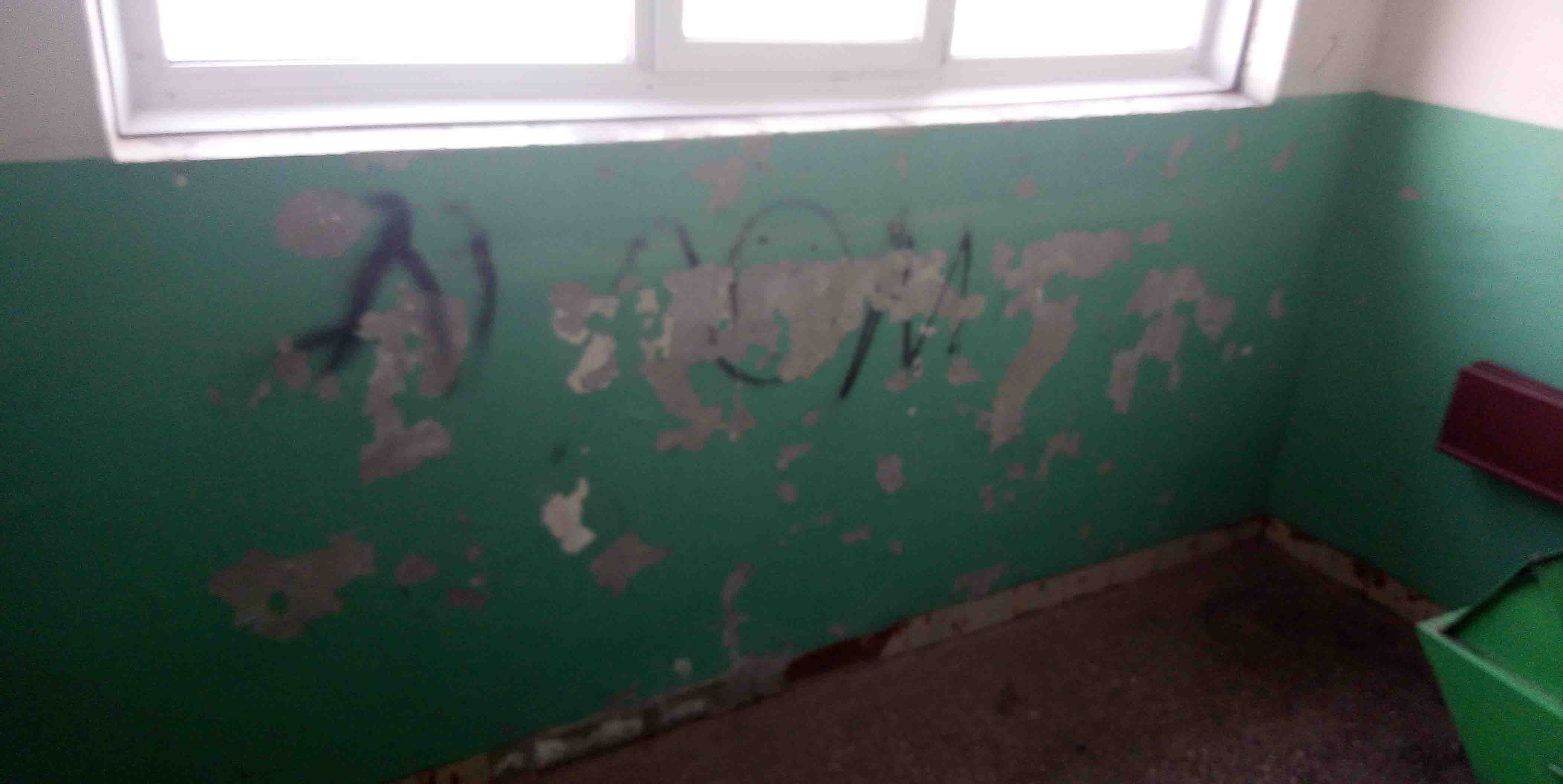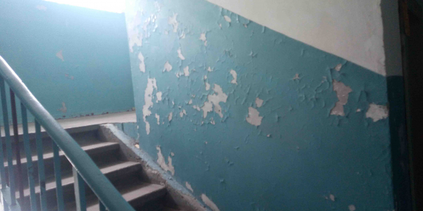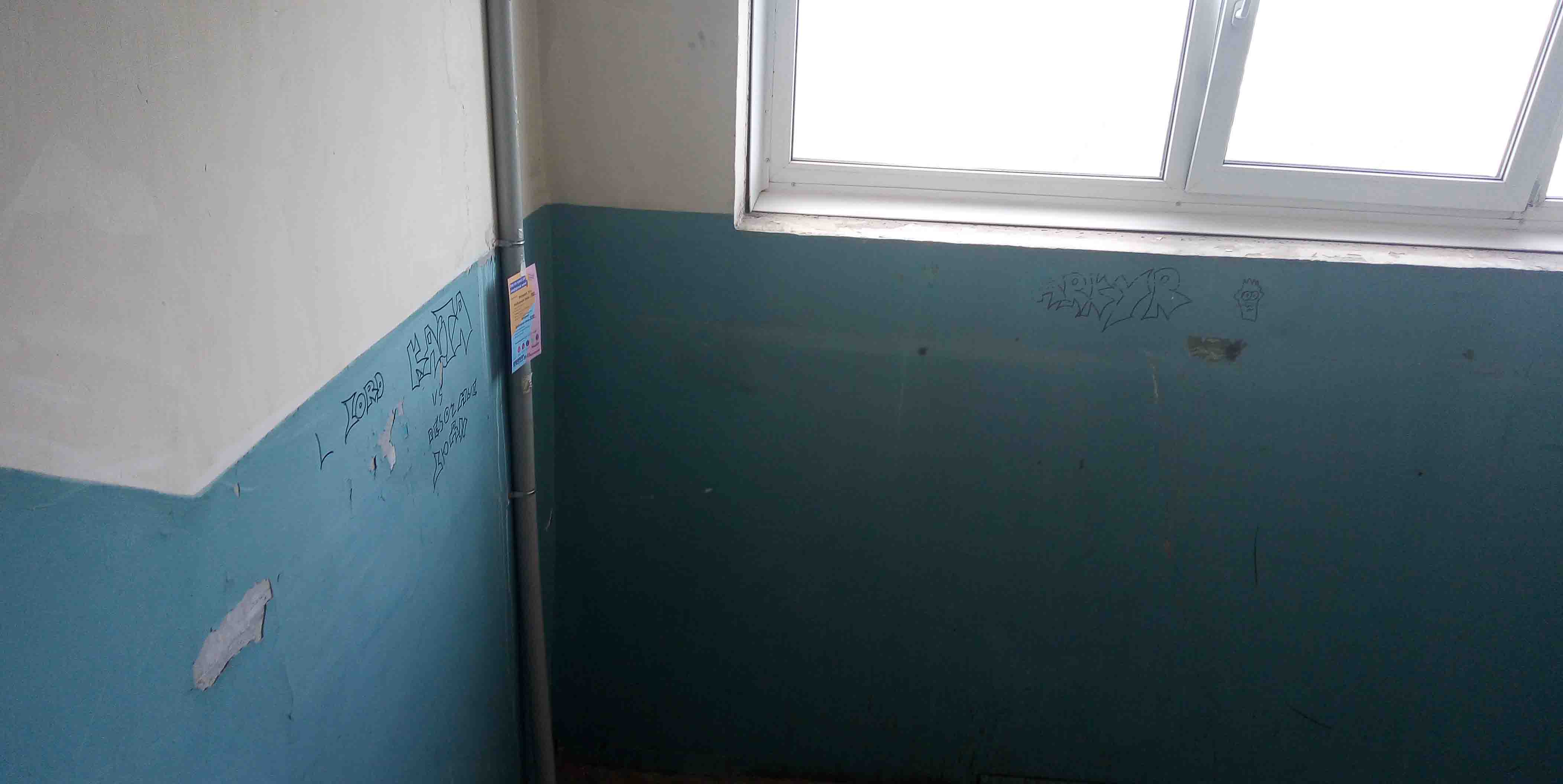 осыпается отделка вокруг окон, и с потолков лестничных пролетов.встречаются надписи и рисунки на стенах.