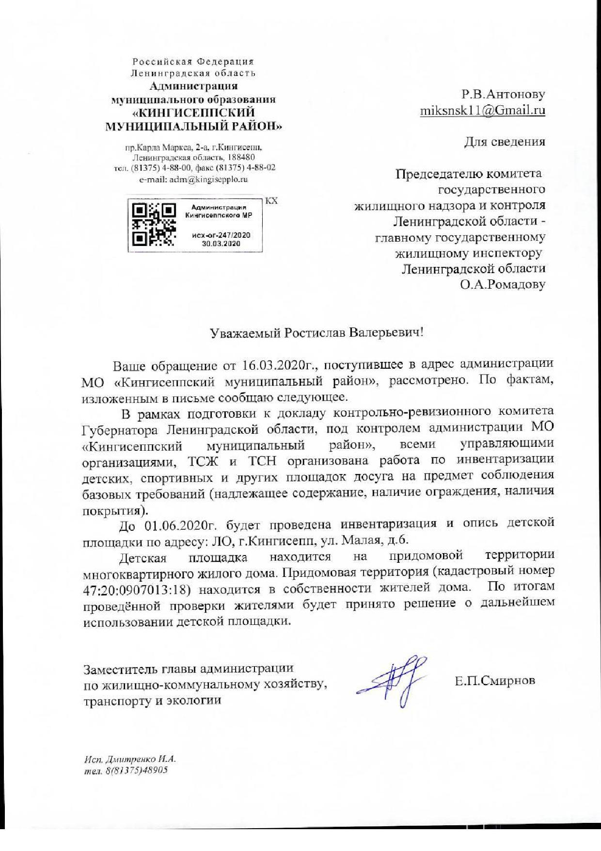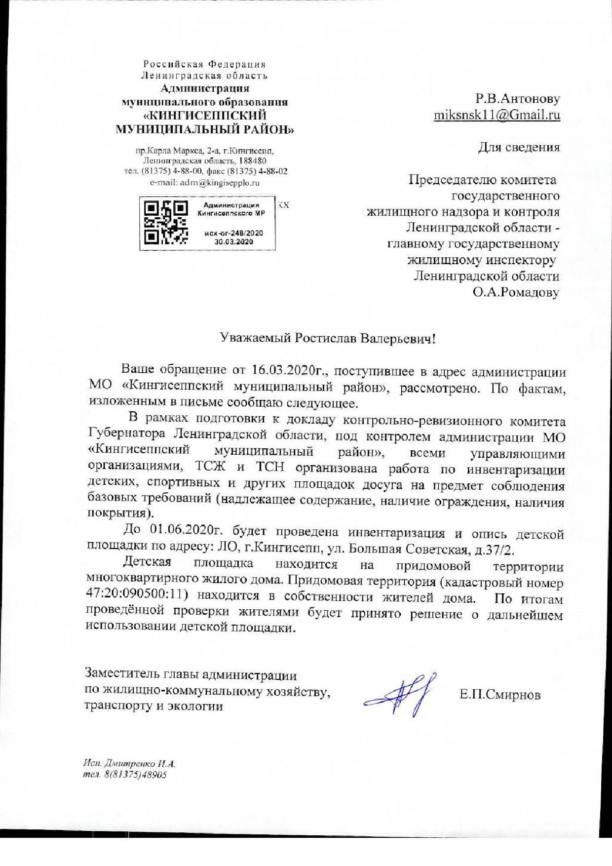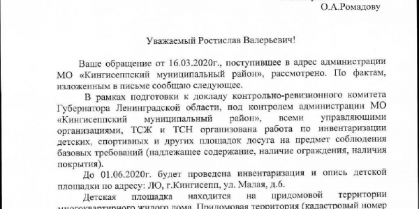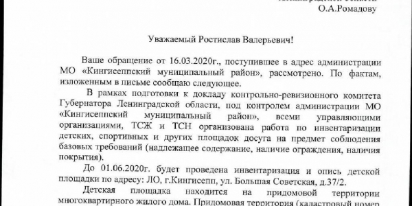 Номер жалобы:64412 Тип жалобы:Иные проблемы ЖКХ Название объекта: Регион:Ленинградская область Город:Кингисепп Адрес:Большая Советская улица, 37/2 Описание жалобы:Площадка опасна для жизни детей. Статус: