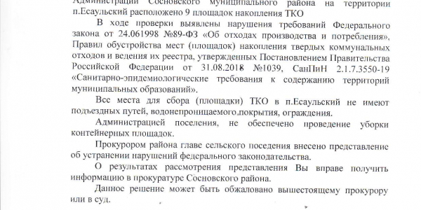 Рег.оператор уведомлен о данных нарушениях, но продолжает оказывать услуги по вывозу и начислять платежи. В Администрации Есаульского с.п также знают и признают ненадлежащее выполнение условий договора, но игнорируют жалобы населения и рекомендуют идти в суд. Или же предложил поставить бак перед моим домом, что также незаконно. На вопрос о предоставлении мне схемы расположения площадок под ТКО, принятой комиссией и реестра, глава поселения отправил на сайт администрации, на котором схемы расположения, подписанной комиссией найти не удалось.