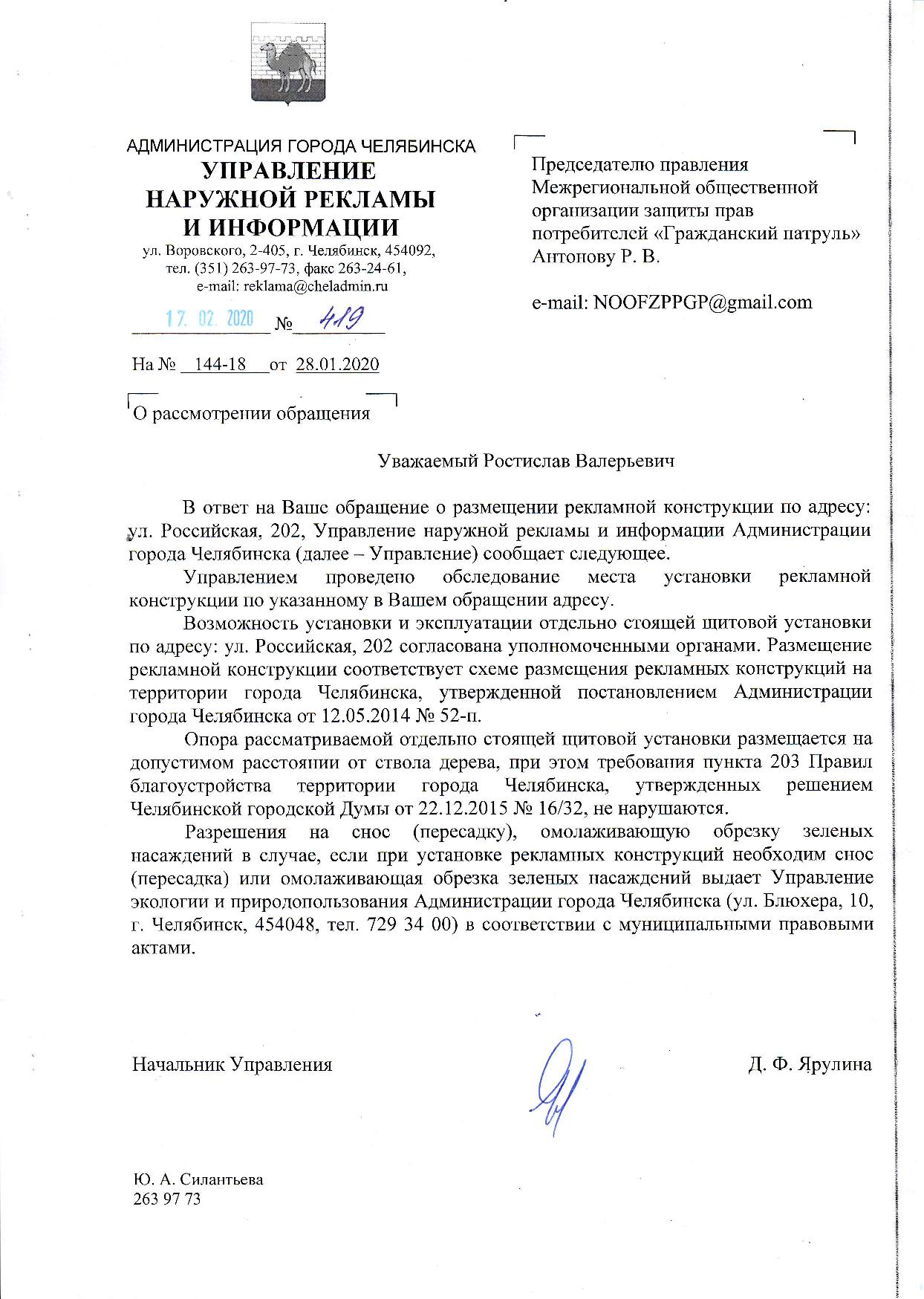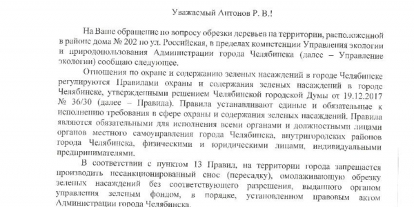 Номер жалобы:63450 Тип жалобы:Иные проблемы ЖКХ Название объекта: Регион:Челябинская область Город:Челябинск Адрес:Российская улица Описание жалобы:На газоне рядом с домом по ул. Российская, 202 стоит рекламный баннер. Перед ним растёт дерево (липа) и его периодически грубо кронируют, чтобы оно не закрывало рекламный баннер. Допустима ли такая агрессивная обрезка? Согласована ли установка этого рекламного баннера? Статус: