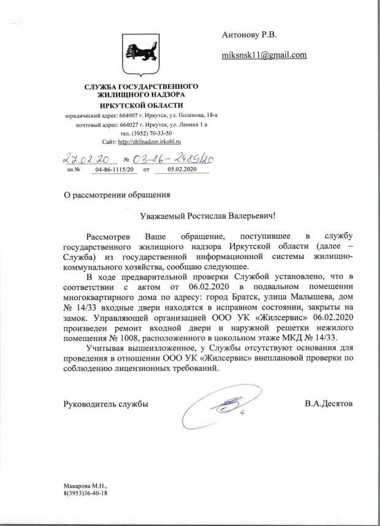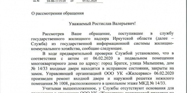 Номер жалобы:63544 Тип жалобы:Иные проблемы ЖКХ Название объекта: Регион:Иркутская область Город:Братск Адрес:улица Малышева, 14/33 Описание жалобы:Улица малышева 14/33Пришли рабочие сломали все двери подвала и так и не сделали ..позвонили мастеру Валентине она сказала вас разберемся прошло уже 22 недели так и не кто не сделал !!дети туда лазят!в квартире из за открытых дверей холодно!!Прошу принять меры!!и разобратся с нашим мастером вообще не хотят делать не чего Статус: