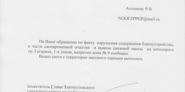 Номер жалобы:63495 Тип жалобы:Иные проблемы ЖКХ Название объекта: Регион:Челябинская область Город:Златоуст Адрес:проспект имени Ю.А. Гагарина, 1-я линия, 9 Описание жалобы:Вот как вывозят снег! Свалили за пригорок! Гагарина 1линия 9!!!!