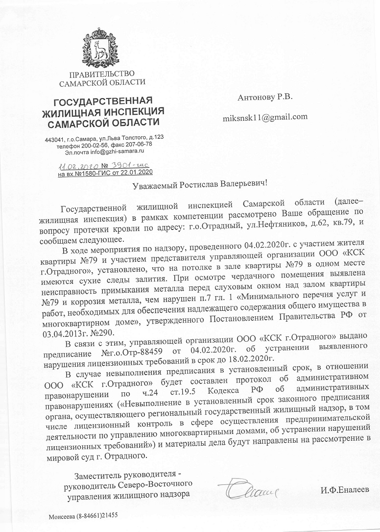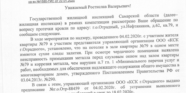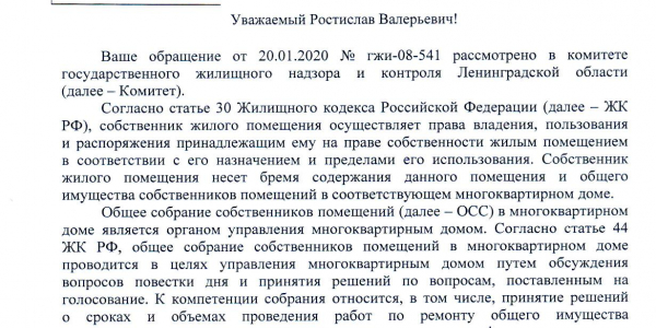 Также мы обращались в Комитет государственного жилищного надзора и контроля Ленинградской области с данной проблемой (№ гжило-08-2173/17-0-0 от 9 марта 2017). Там нам сообщили, что причиной протечки является деформация сварных швов кровельного материала на отдельных участках. Работы по устранению дефектов обещали произвести в срок до конца апреля 2017. Однако проблема не была решена.