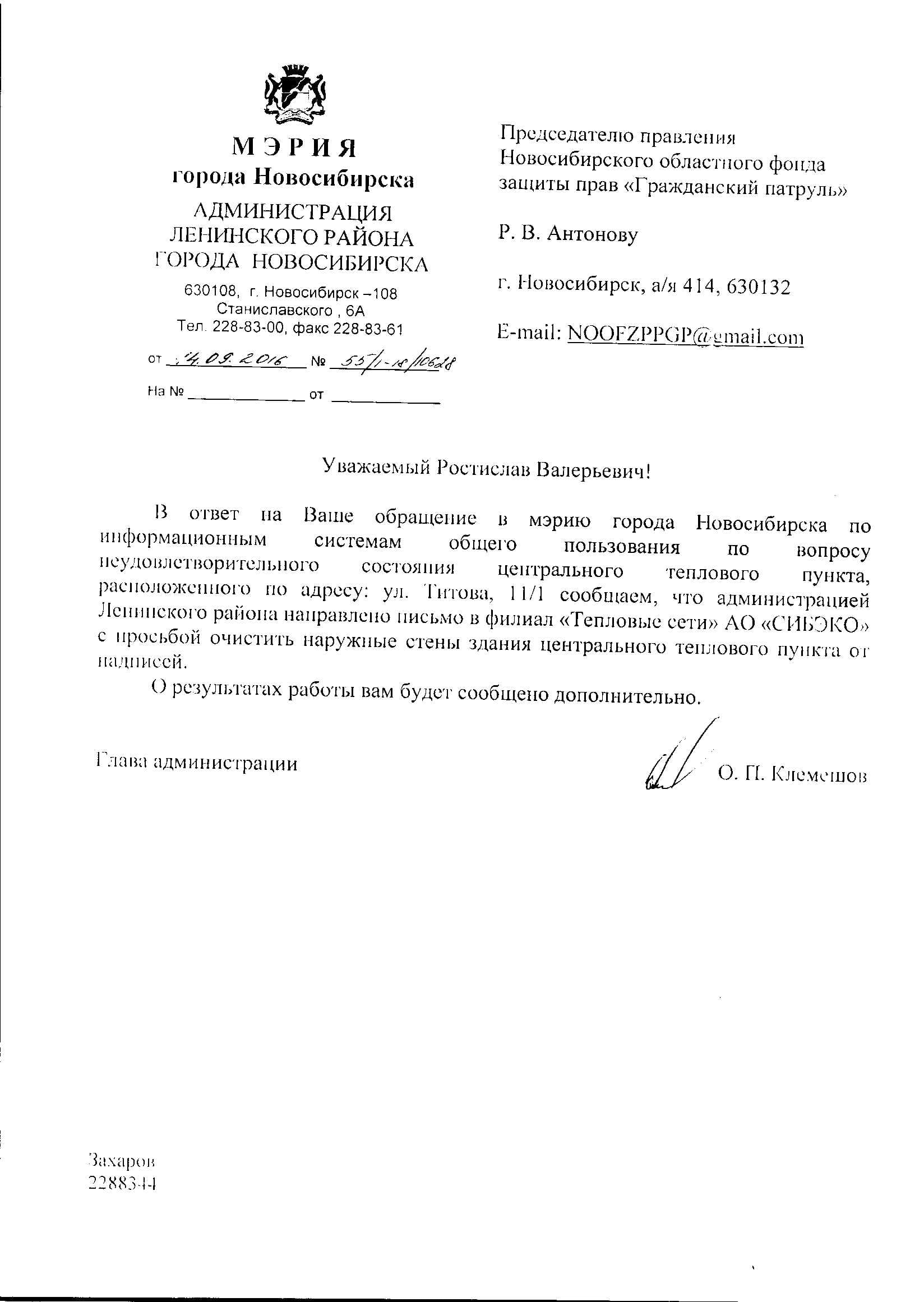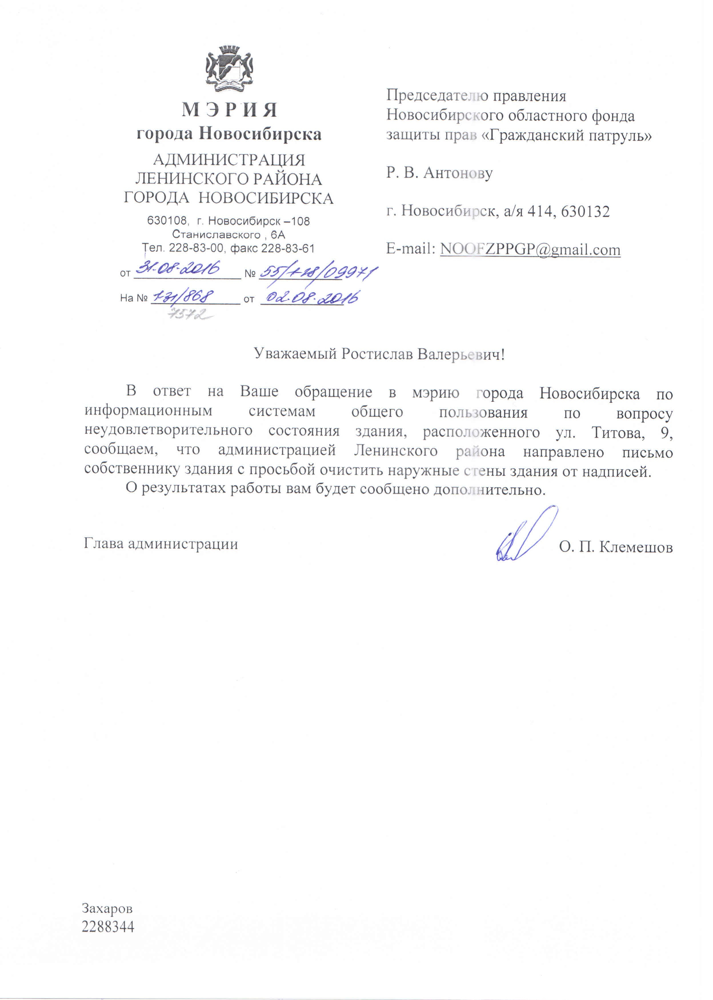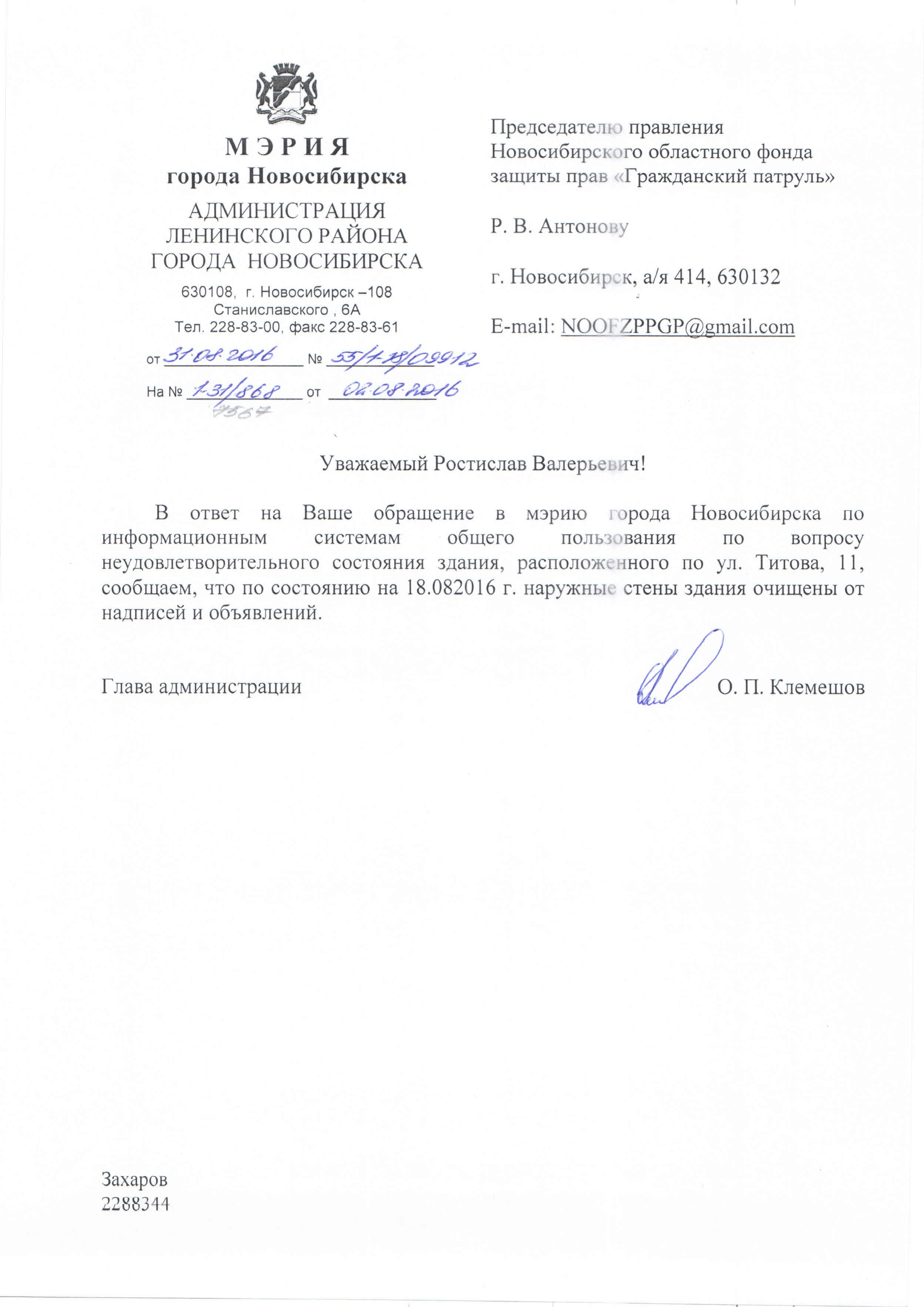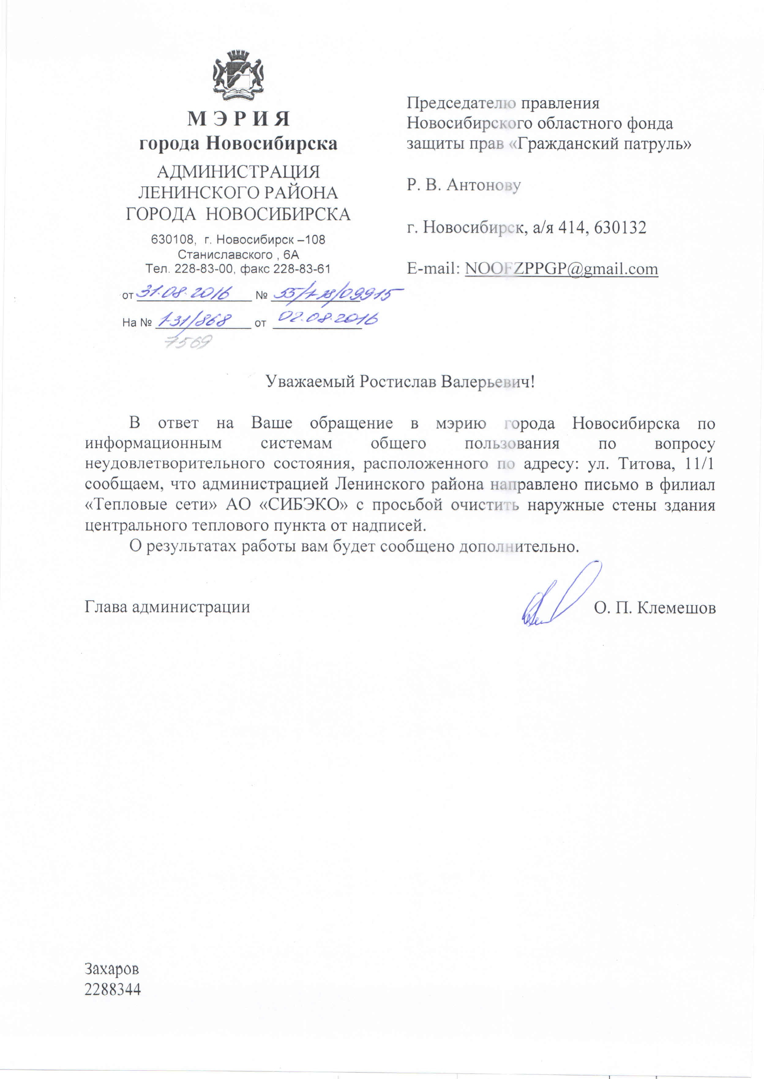Номер жалобы:7564 Тип жалобы:Иные проблемы ЖКХ Название объекта:Управляющая Компания Город:Новосибирск Адрес:Новосибирск, улица Серафимовича, 1 Описание жалобы:Надписи по адресу Серафимовича 1 Статус: