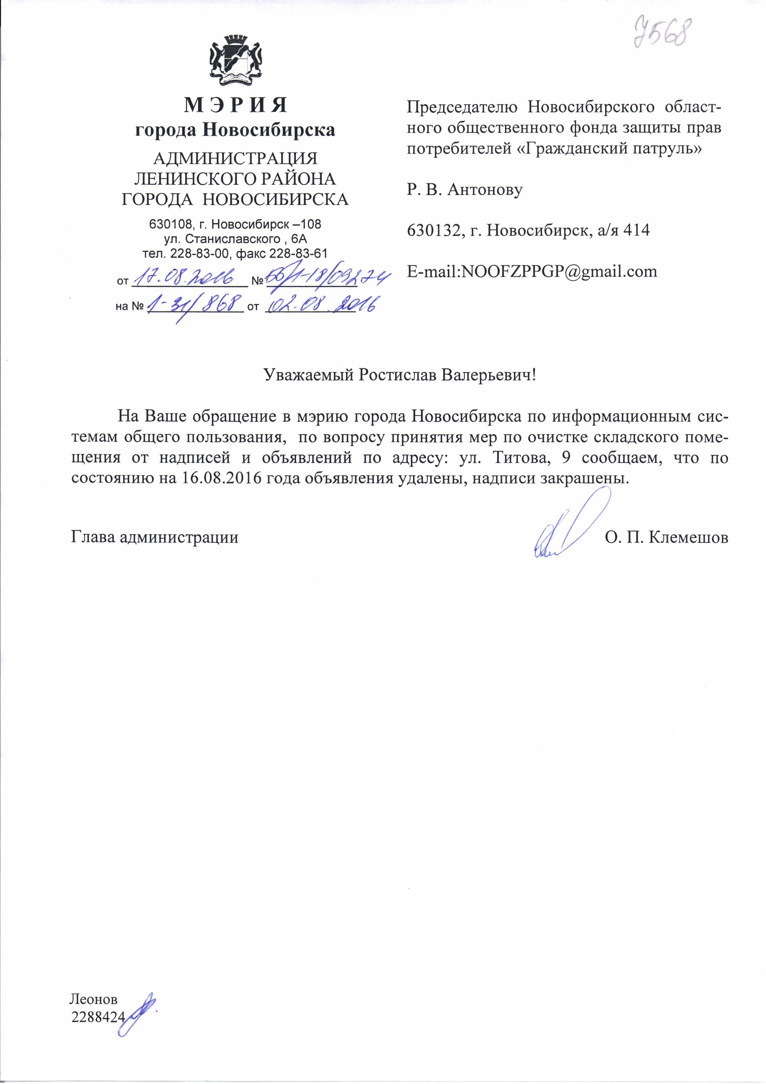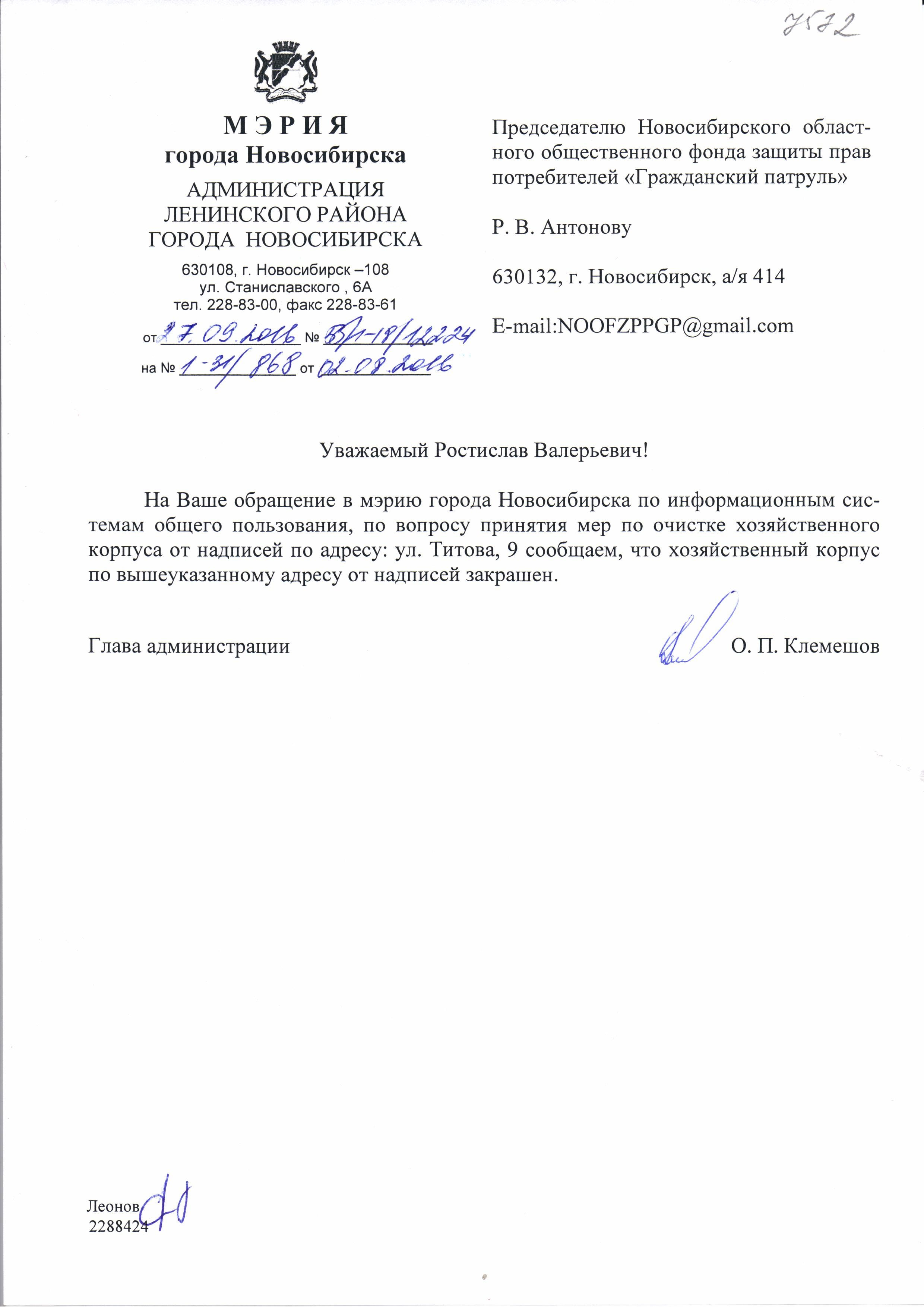 Номер жалобы:7568 Тип жалобы:Иные проблемы ЖКХ Название объекта:Управляющая Компания Город:Новосибирск Адрес:Новосибирск, улица Титова, 9 Описание жалобы:Хоз корпус в надписях и объявлениях Статус: