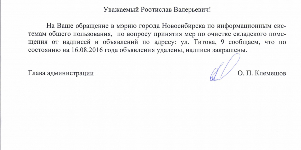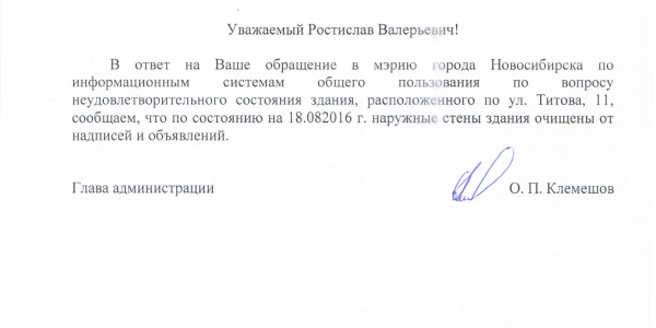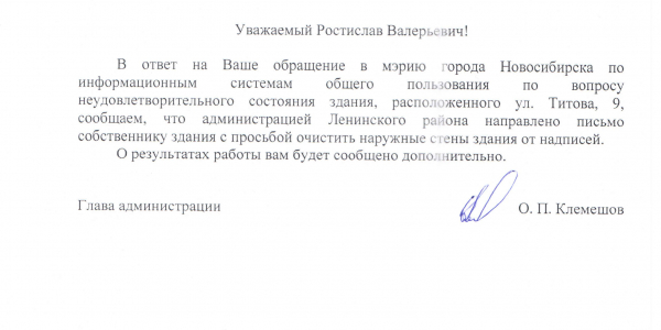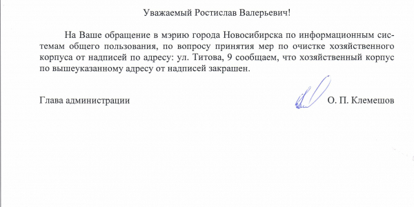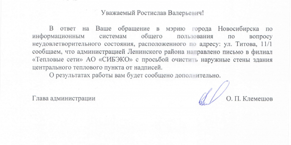 Номер жалобы:7569 Тип жалобы:Иные проблемы ЖКХ Название объекта:Управляющая Компания Город:Новосибирск Адрес:Новосибирск, улица Титова, 11/1 Описание жалобы:Надписи на хоз корпусе вблизи дома Статус: