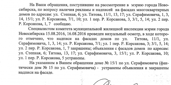 Номер жалобы:7563 Тип жалобы:Иные проблемы ЖКХ Название объекта:Управляющая Компания Город:Новосибирск Адрес:Новосибирск, улица Серафимовича, 3 Описание жалобы:Объявления на стене дома и присутствуют надписи Статус: