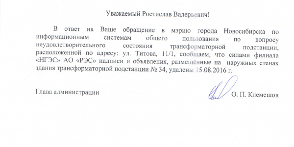 Номер жалобы:7560 Тип жалобы:Иные проблемы ЖКХ Название объекта:Управляющая Компания Город:Новосибирск Адрес:Новосибирск, улица Титова, 11/1 Описание жалобы:Надписи на хоз корпусе вблизи дома Статус: