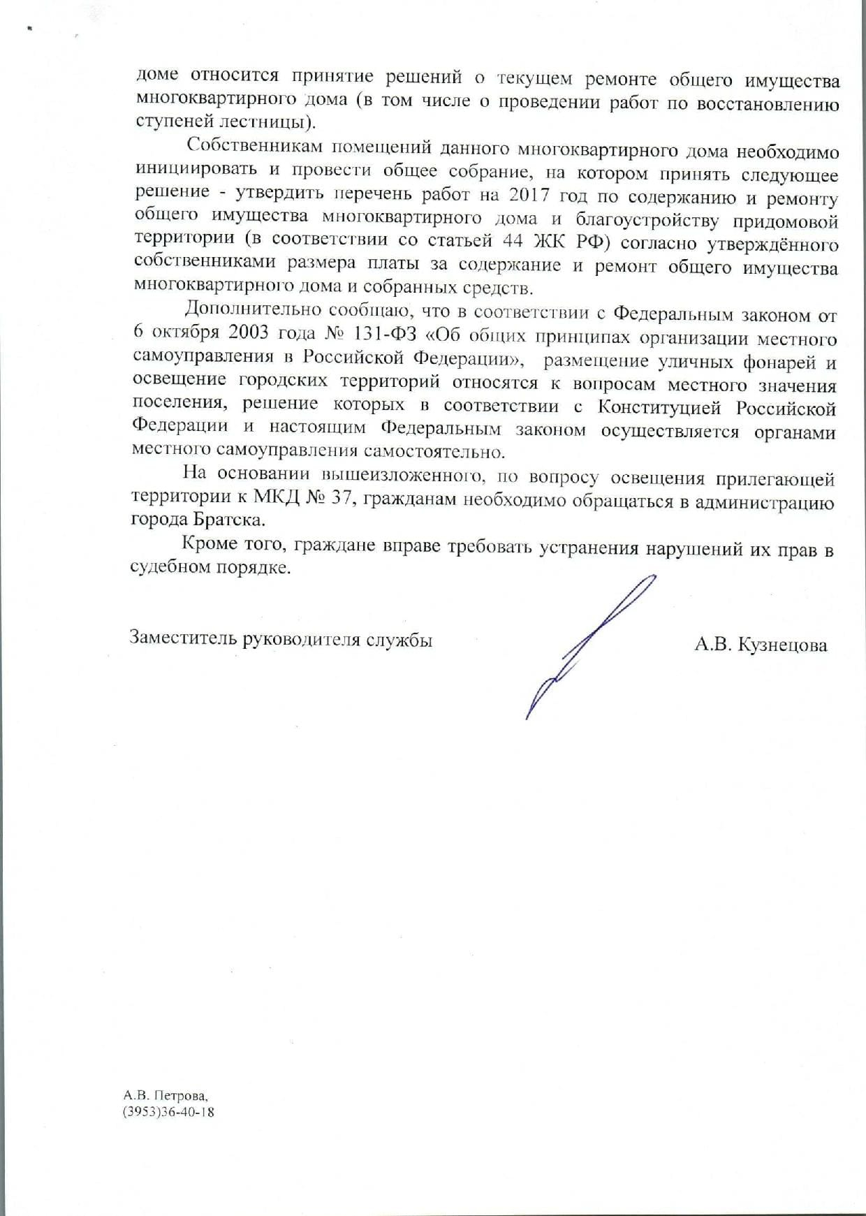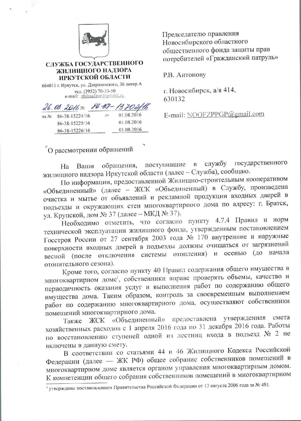 Номер жалобы:7499 Тип жалобы:Иные проблемы ЖКХ Название объекта:Жилищный Трест Регион:Иркутская область Город:Братск Адрес:ул. Крупской, 37 Описание жалобы:Подьезд 2. Загрязнение входной двери, надписи вокруг. Статус: