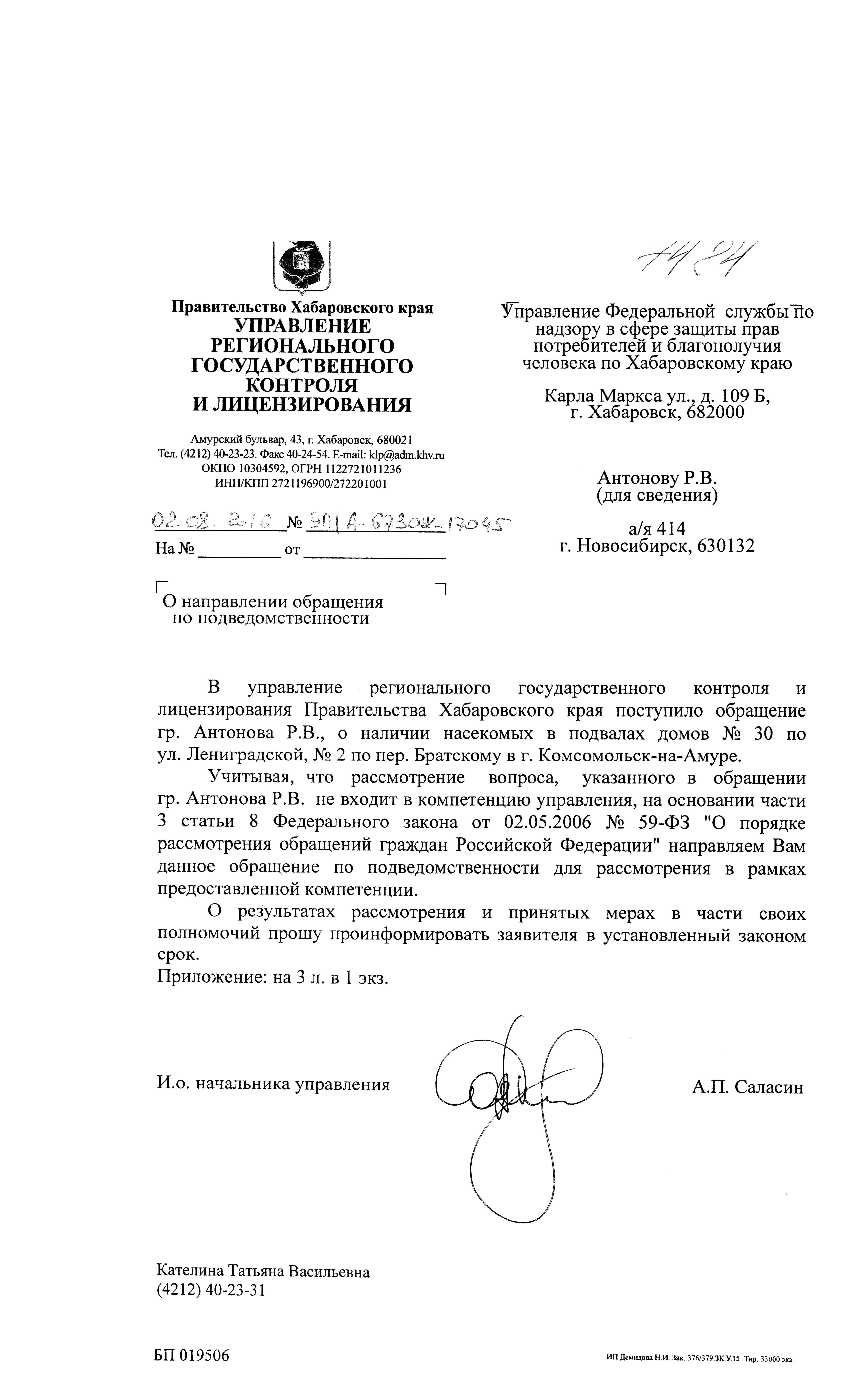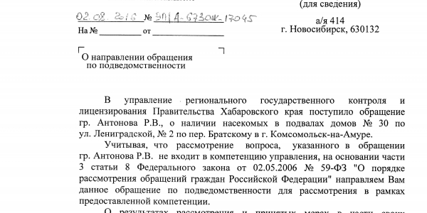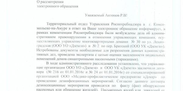 Номер жалобы:7484 Тип жалобы:Иные проблемы ЖКХ Название объекта:Амурлтфт-Дземги Город:Комсомольск-на-Амуре Адрес:Комсомольск-на-Амуре, улица Ленинградская, 30 Описание жалобы:У нас в доме а точнее в подвале,с торца дома и в колодцах между домами Ленинградская 30 и Братский 2 завелись большие черные тараканы(их среда обитания Африка и Азия)управляющая организация ни как на обращения жильцов не реагирует и отправляет в санэпидемстанцию а те в своё время отправляют нас в управляющую организацию и ни кто эту проблему решать не собирается !