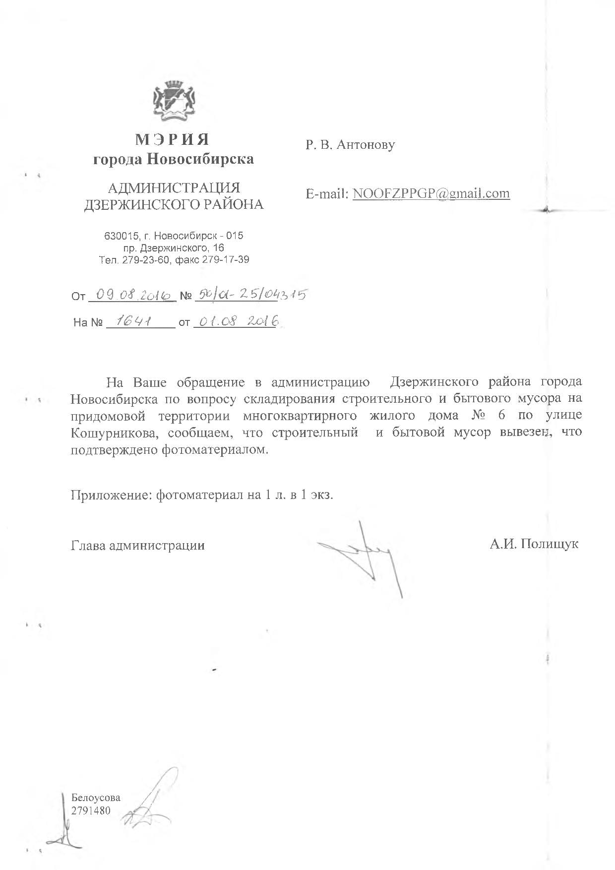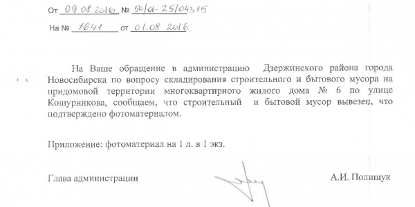 Номер жалобы:7483 Тип жалобы:Иные проблемы ЖКХ Название объекта:Мэрия Регион:Новосибирская область Город:Новосибирск Адрес:ул. Кошурникова, 6 Описание жалобы:Свалка Статус: