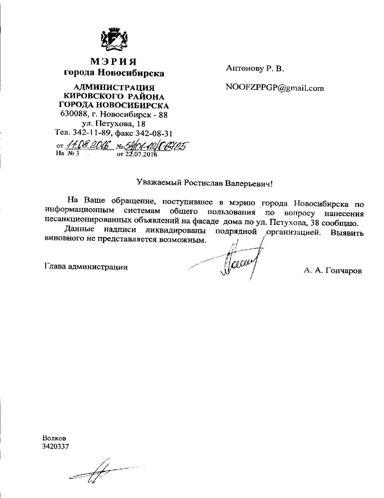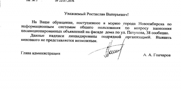 Номер жалобы:7359 Тип жалобы:Иные проблемы ЖКХ Название объекта:Управляющая Компания Регион:Новосибирская область Город:Новосибирск Адрес:ул. Петухова, 12/3 Описание жалобы:Надписи на стенах дома Статус: