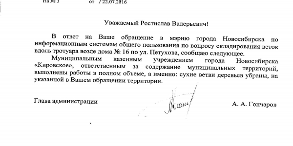 Номер жалобы:7366 Тип жалобы:Иные проблемы ЖКХ Название объекта:Управляющая Компания Регион:Новосибирская область Город:Новосибирск Адрес:ул. Петухова, 16 Описание жалобы:Куча веток у тротуара на пути к дому Петухова 16 Статус: