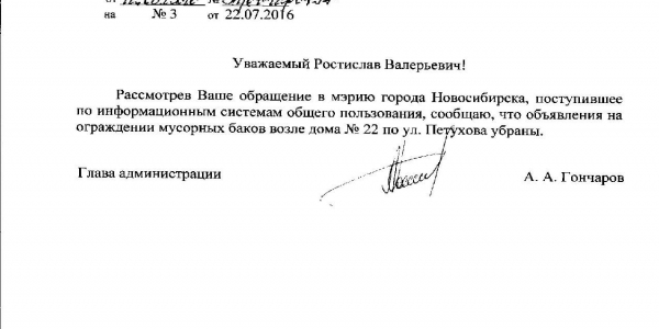 Номер жалобы:7357 Тип жалобы:Иные проблемы ЖКХ Название объекта:Управляющая Компания Регион:Новосибирская область Город:Новосибирск Адрес:ул. Петухова, 22 Описание жалобы:Объявления в неположенном месте по адресу петухова 22 Статус: