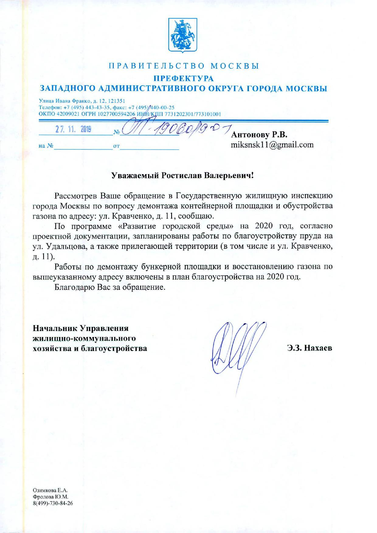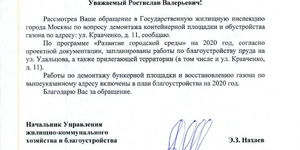 Номер жалобы:61573 Тип жалобы:Иные проблемы ЖКХ Название объекта: Регион:Москва Город:Москва Адрес:улица Кравченко, 11 Описание жалобы:Следует демонтировать стены бывшей контейнерной площадки, ныне никак неиспользуемой, и асфальтовое покрытие внутри неё и воссоздать газон на её месте Статус: