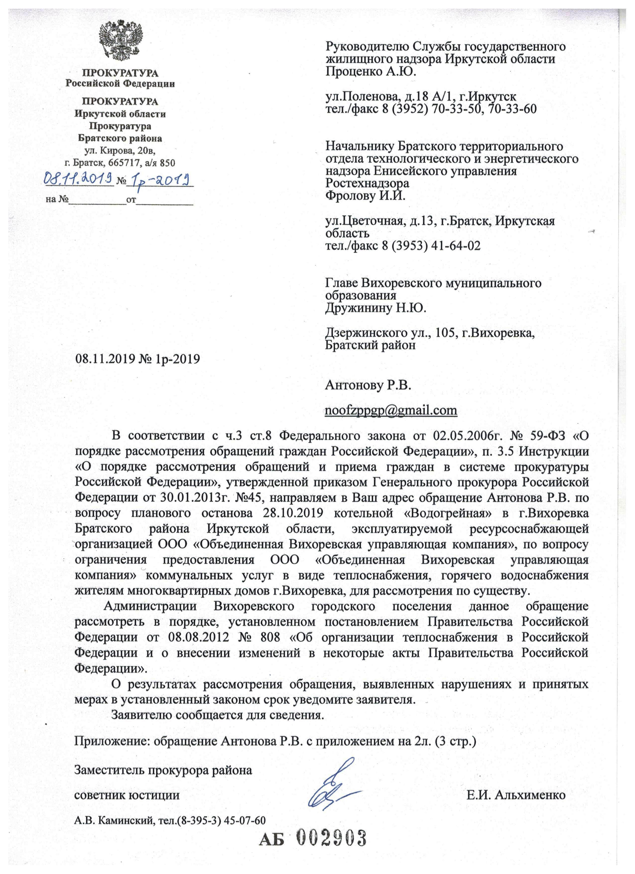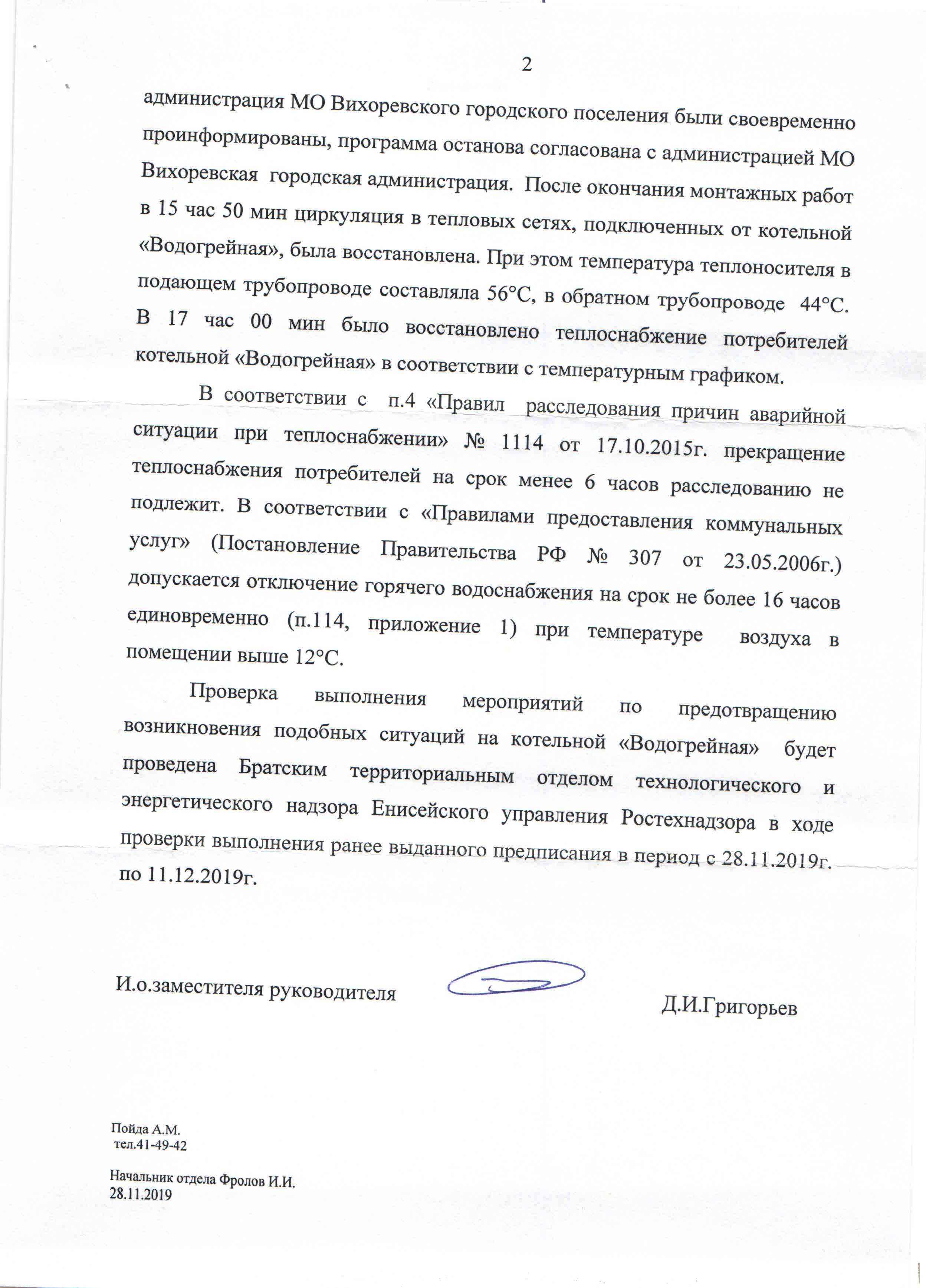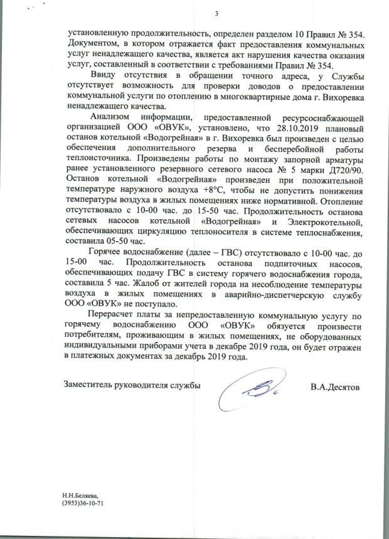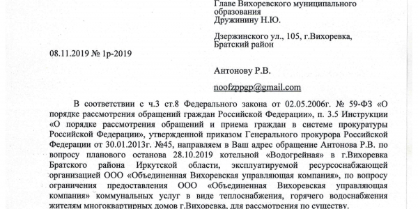 Номер жалобы:61600 Тип жалобы:Иные проблемы ЖКХ Название объекта: Регион:Иркутская область Город:Вихоревка Адрес:Вихоревка Описание жалобы:Может ли быть плановое отключение котельной в Вихоревке на ремонт, в разгар отопительного сезона?