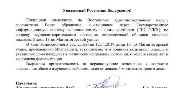 Номер жалобы:61594 Тип жалобы:Иные проблемы ЖКХ Название объекта: Регион:Москва Город:Москва Адрес:Магнитогорская улица, 13 Описание жалобы:На 6 подъезде болтается лист железа Статус: