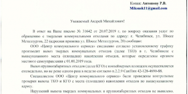 Номер жалобы:61501 Тип жалобы:Иные проблемы ЖКХ Название объекта: Регион:Челябинская область Город:Челябинск Адрес:шоссе Металлургов, 20 Описание жалобы:Большач куча мусорных пакетов с мусором который скоро начнет разлетаться лежит уже больше 2 недель возле мусорной площадки и никто ее не вывозит Статус: