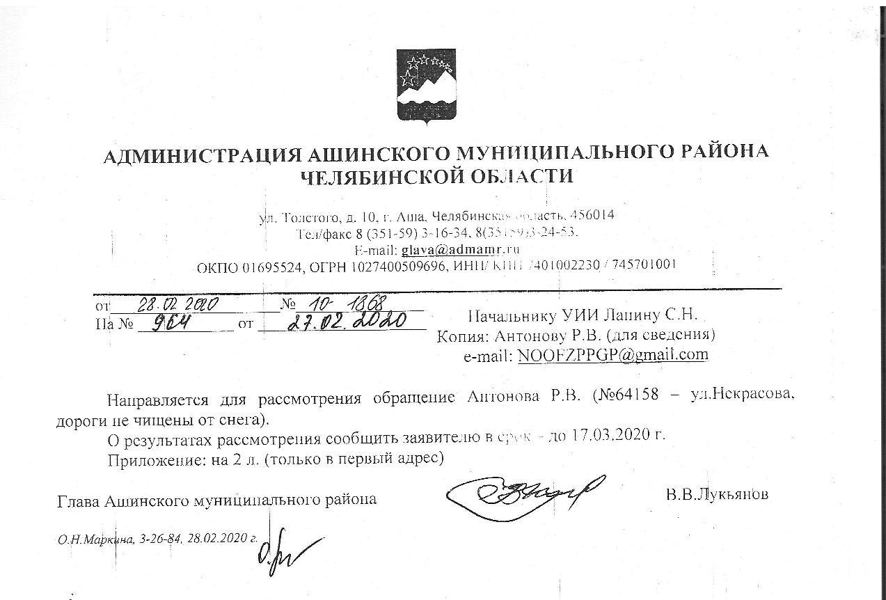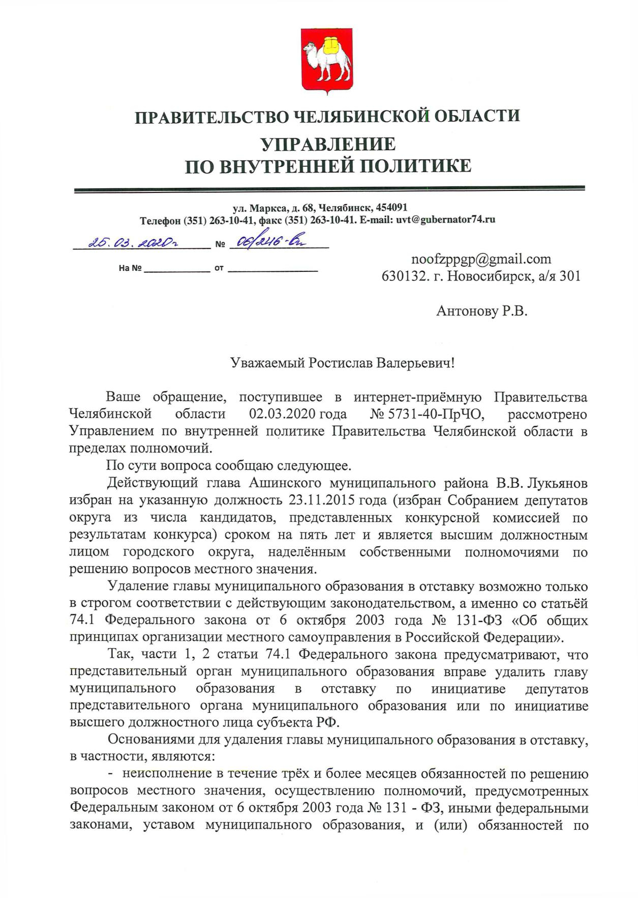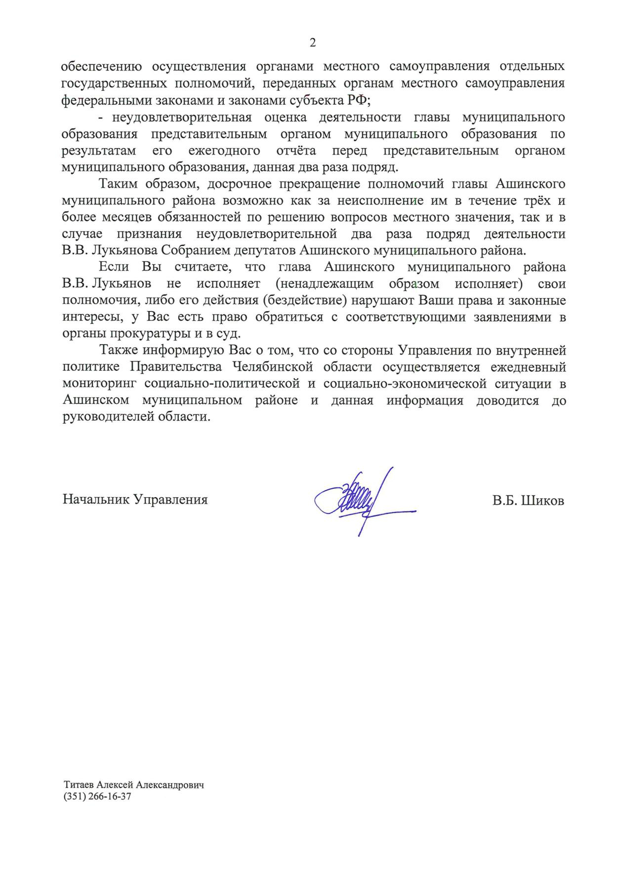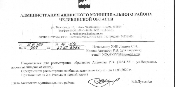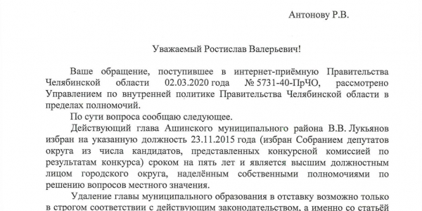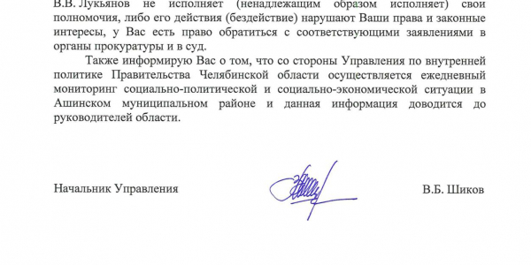Гражданский патруль просит Вас решить вопрос о соответствии занимаемой должности Главы Ашинского района Лукьянова В.В. и назначить более ответственного руководителя. Статус: