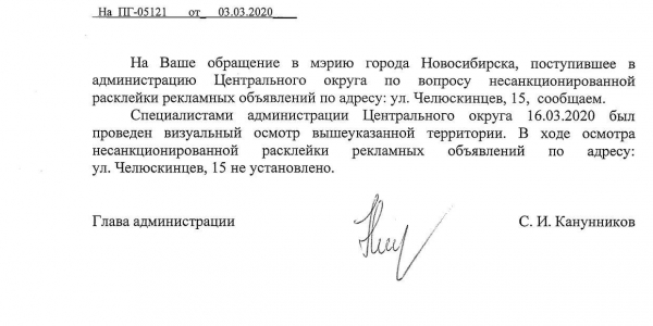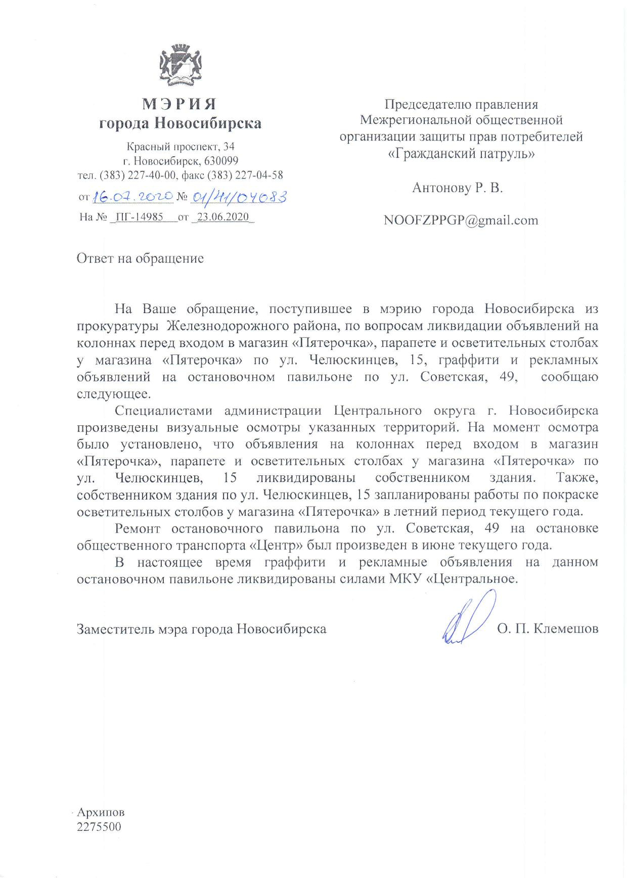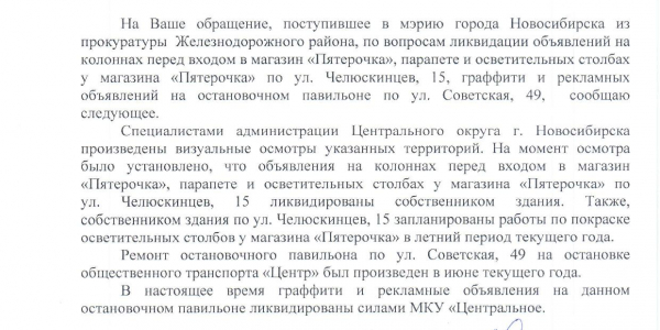 Номер жалобы:64204 Тип жалобы:Городская среда Название объекта: Регион:Новосибирская область Город:Новосибирск Адрес:Челюскинцев, 15 Описание жалобы:Колонны перед входом в магазин "Пятерочка" в объявлениях и рекламе. Также объявления присутствуют на парапете и осветительных столбах, расположенных между тротуаром и проезжей частью по данной улице. Статус: