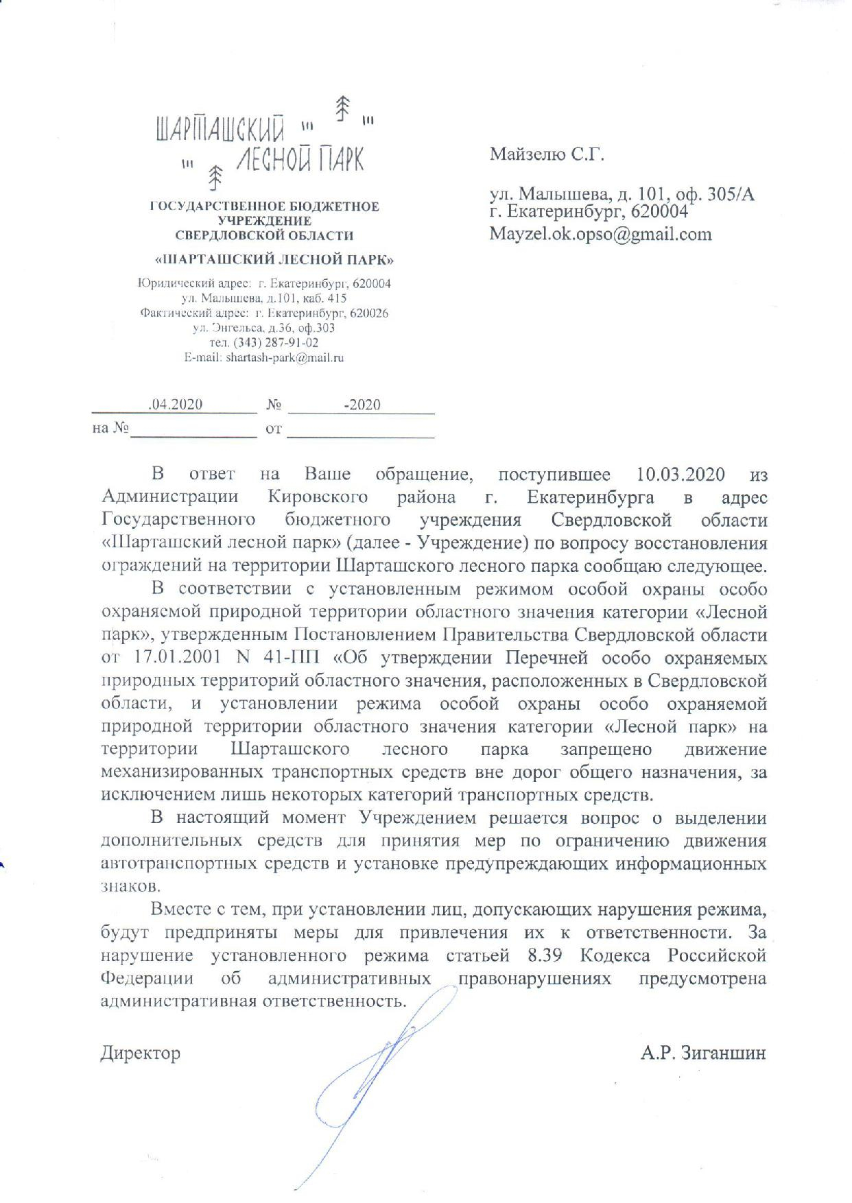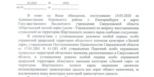 Номер жалобы:64210 Тип жалобы:Прочее Название объекта:Министерство природных ресурсов Свердловской области Регион:Свердловская область Город:Екатеринбург Адрес:(56.845260, 60.677587) Описание жалобы:В Шарташском лесопарке необходимо восстановление ограждений для препятствия заезда автомобилей на аллею, ведущую к скалам Шарташские каменные палатки с дороги, ведущей к СНТ «Гранит» и СНТ «Карасики» в месте с координатами 56.845260, 60.677587. Статус: