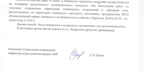 Номер жалобы:64158 Тип жалобы:Прочее Название объекта:Администрация г.Аши Регион:Челябинская область Город:Аша Адрес:улица Некрасова Описание жалобы:Проживаем в г. Аша по ул Некрасова дома 2 - 18, въезд в наш проулок совсем не чистится , даже пешком пройти очень сложно. Ежедневно подаём заявки на очистку, во все инстанции, везде обещают, но никто и ничего не делает, с главной дороги на проулок начали нагребать снег. Если что то случится, к нам не заедет ни один транспорт. Статус: