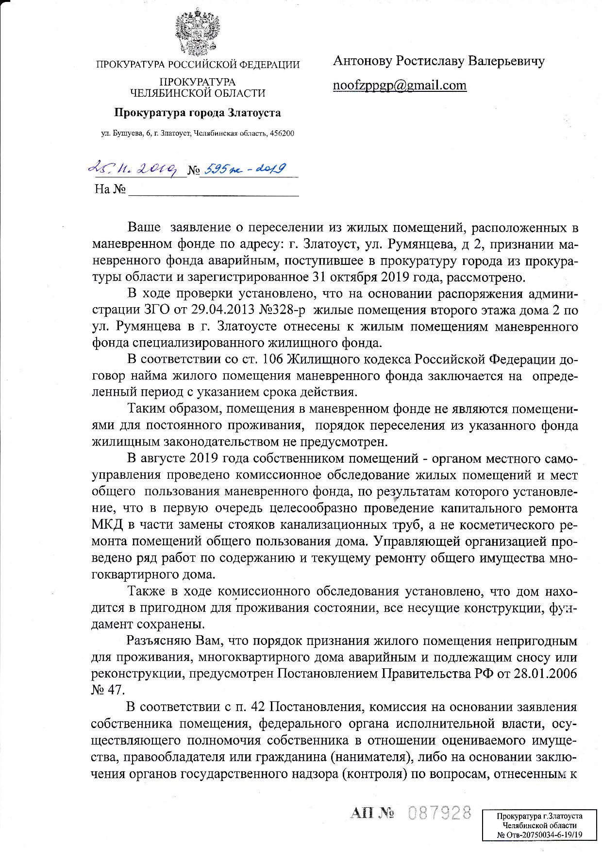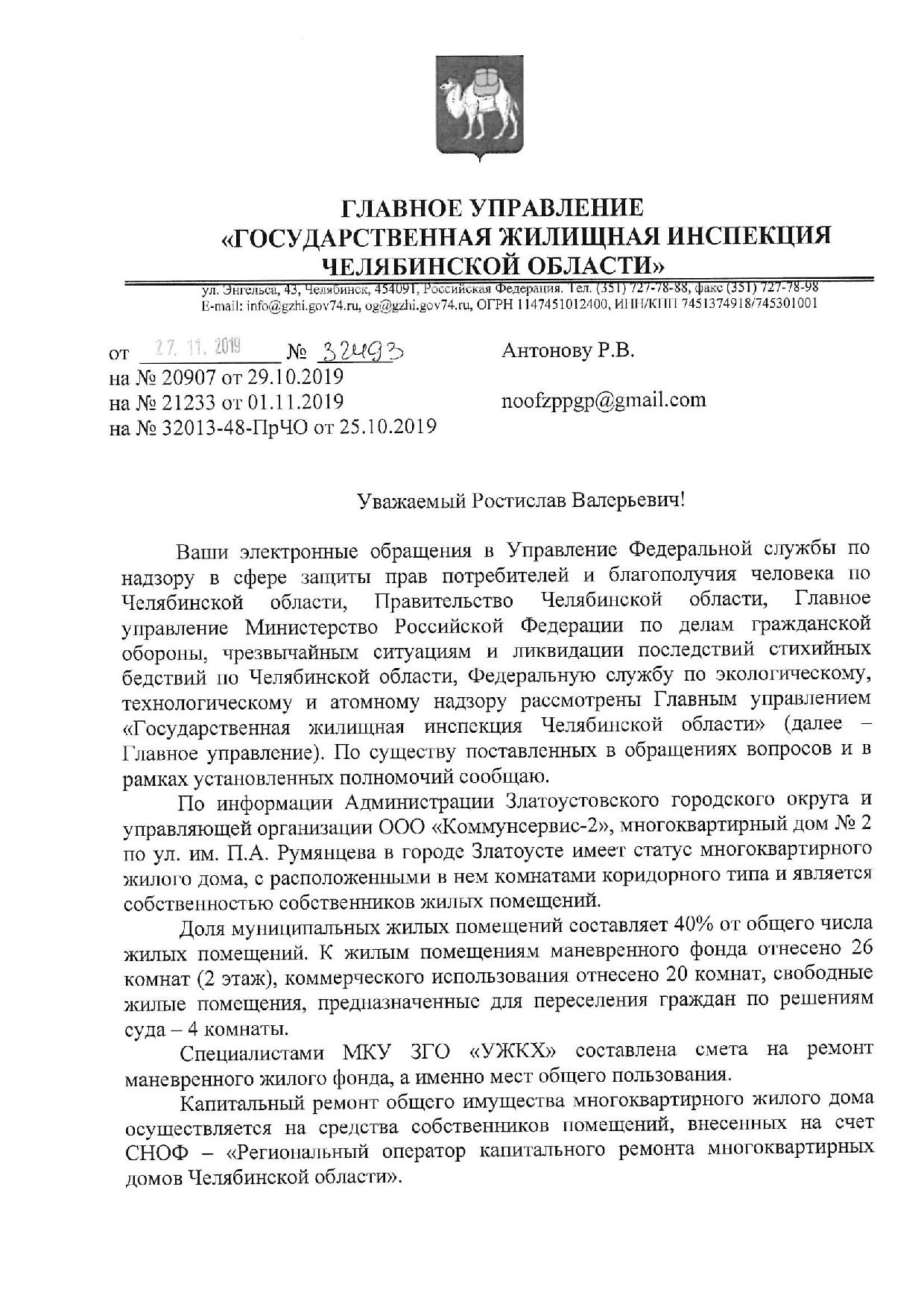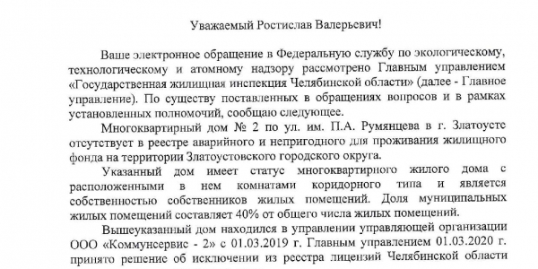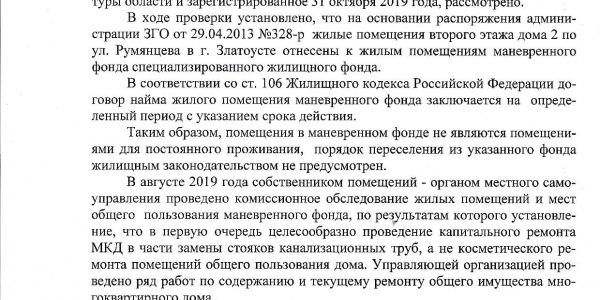 Номер жалобы:61166 Тип жалобы:Иные проблемы ЖКХ Название объекта: Регион:Челябинская область Город:Златоуст Адрес:улица Румянцева, 2 Описание жалобы:В Златоусте на ул. Румянцева, дом 2 жители кричат о помощи. Вот такой маневренный фонд в общежитии. В их доме комнаты зарастают в грибке, одолевают блохи. 1 марта в общежитии убрали вахту, а первый этаж превратился в общественный туалет. А по вечерам здесь собираются незванные гости, чтобы сходить в туалет и употребить. В доме живут пенсионеры и многодетные мамы. Статус: