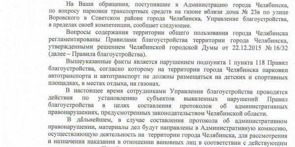 Номер жалобы:61191 Тип жалобы:Иные проблемы ЖКХ Название объекта: Регион:Челябинская область Город:Челябинск Адрес:улица Воровского, 23В Описание жалобы:Парковка на газоне Статус: