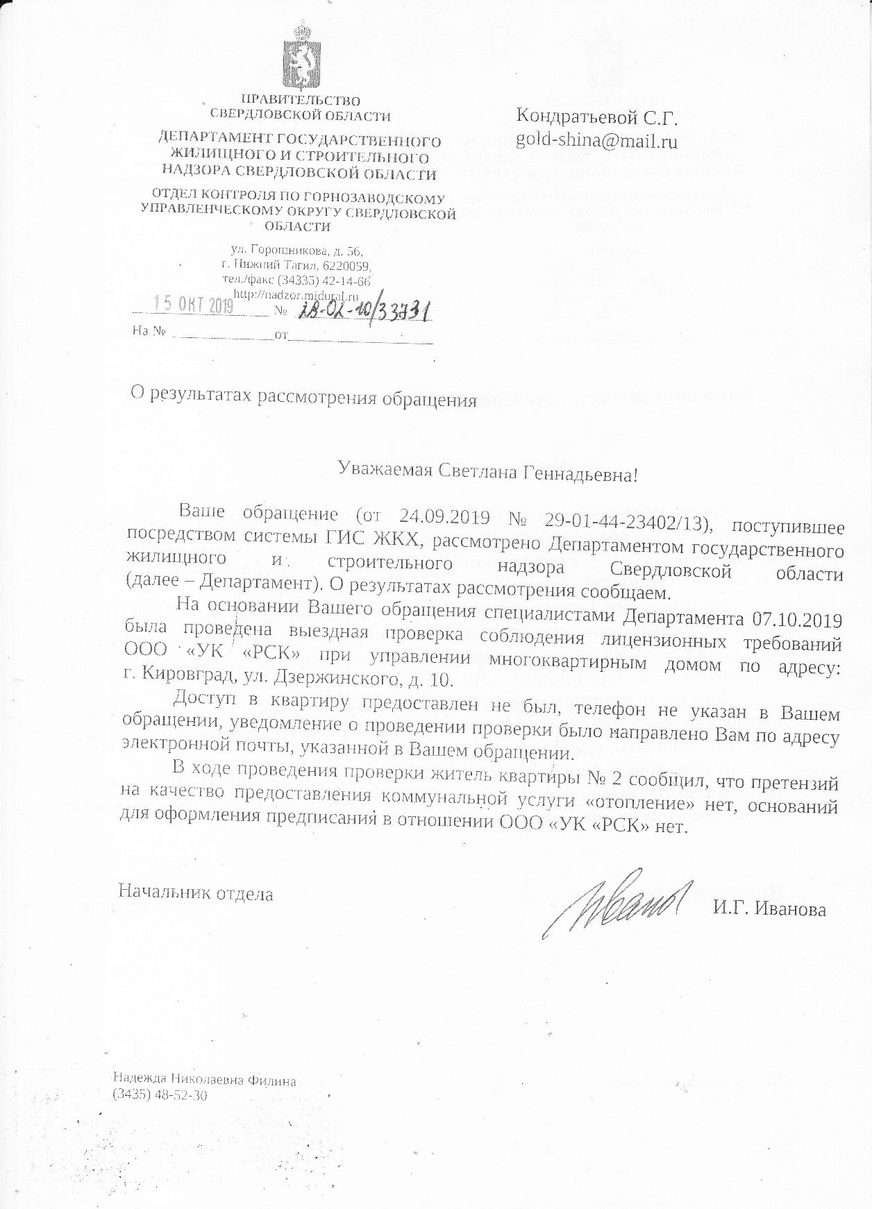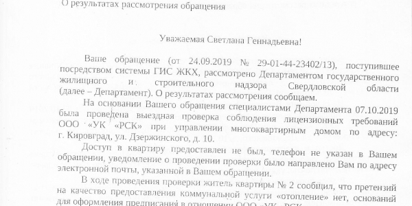 Номер жалобы:60539 Тип жалобы:Иные проблемы ЖКХ Название объекта: Регион:Свердловская область Город:Кировград Адрес:улица Дзержинского, 10 Описание жалобы:Сегодня уже 23 сентября! Отопления все еще нет! За окном -2! Дома +14! Конденсат на окнах - просто ручьем! Дома влажность наверное процентов 80-90! Спать ложишься в мокрую постель! Утром одеваешь мокрую одежду! Отопление в городе дали с 14 числа, но до нас не доходит! Все в прорывах. Диспетчера ОблКоммунэнерго объясняют - начнется рабочая неделя - будем делать! В прокуратуру г. Кировграда обращаться бесполезно! Статус: